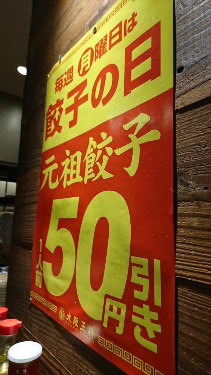 秋葉原、末広町駅近く。中央通り沿いにあります。テーブル席は二人席も多く、一人でも餃子を食べながらビール、ハイボールといった飲み方も可能。餃子一人前50円引きにお店はひかれて入りました。お店のなかでは、店員さんの元気な怪しい日本語も飛び交っていて、ざわざわしていますが、本家の王将と同様、頼むとすぐ来るのが嬉しい。餃子は安定性の味。回鍋肉は、キャベツがしゃきしゃきしていて美味。本家の王将よりもお店の雰囲気が、おしゃれな気がしました。ただし、月曜日だけ餃子が50円引きですが、このポスターだと、間違えてしまうのは私だけだろうか?