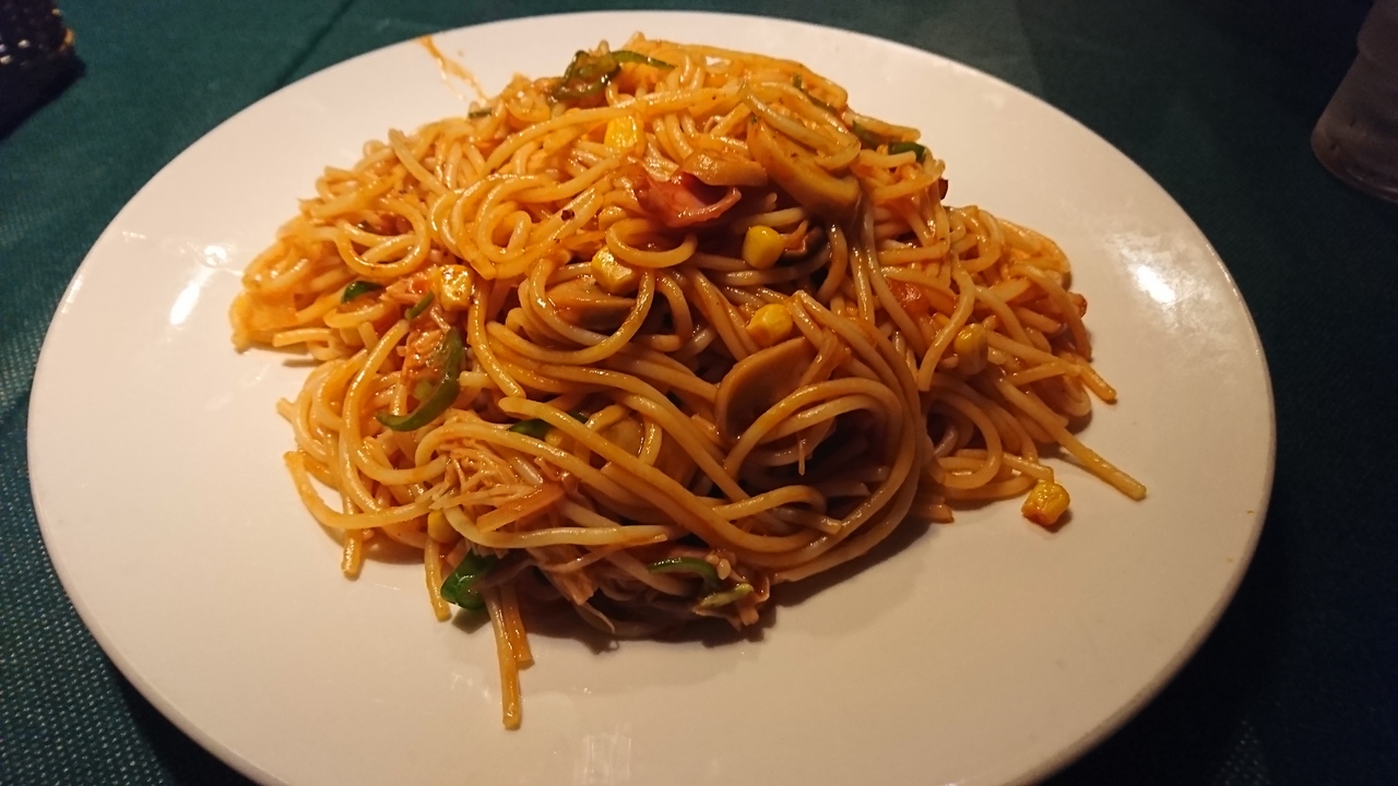 秋葉原駅から万世橋方向へ。交差点のところにあるビルの地下1階にあるお店。大盛りパスタで有名なお店ですが、夜23時15分までオーダーメイド可能なイタリアンのお店て、パスタ以外にもメニュー多数。オムライスや豚の生姜焼き、ドリアなども1000円程度。ちなみに隣はセガのゲームセンターでは、このお店のレシートを持っていくとサービスがあるとか。「ナポリタン」をオーダー。やや太い麺に、ケチャップの味がしっかり絡んでいて懐かしい味。ガツ盛りはかなりのボリュームですが、美味しくいただけました。冷たいお茶のサービスがあり、これだけでもかなり嬉しい。