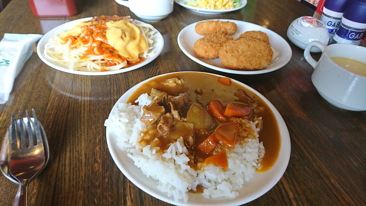 春吉にある洋食屋さん。明るい店内は、カウンター席とテーブル席が少々。店主の趣味なのか、釣り関係の広告が並びます。名物はトルコライス。普通盛り、大盛り、バカ盛りとあり、大盛りは普通盛りの2倍、バカ盛りは3倍もあるとか。普通盛りでもかなりの量があるので、自信がなければ大盛りは頼まないほうがよいと思います。カレーピラフとスパゲティはご主人が、揚げ物サラダは奥さまが担当のようです。注文後揚げるカツはサクサク。カレーピラフは辛さがほどよく懐かしい香り。ナポリタンも昔から食べている細麺の家庭の味。大きな鍋で作られたカレーは、かける前に小さな鍋で暖められ、カツとピラフの上へ。挽き肉カレーは、カレーピラフとのコラボで後から辛さがやって来ます。子供時代に大好きだったカレー、ピラフ、ナポリタン、カツを一気に、しかもかなりのボリュームで食べられる満足度の高いお店です。大盛り以上を完食した人、完食できなかった人だけが書き込むことのできるノートがあります。