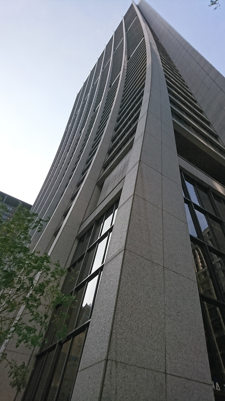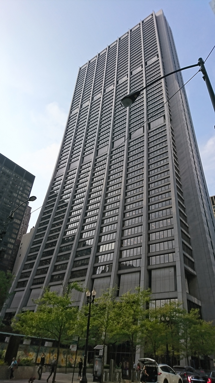 CTAレッドライン、ブルーラインのモンロー駅に直結したビル。高さ259.1メートルの建物は、階が上になるにつれてフロアー面積が少しずつ減っていき、下から見ると曲線になっています。なんとなく見たことのある建物だと思っていたら、西新宿の「損保ジャパン日本興和本社ビル」にそっくり。まるで西新宿にいるかと錯覚。1969年に竣工したということなので!こちらの方が7年早くできています。低層が膨らんでいるので横から見ると富士山のようにも見えます。駅から地上に上がるとき、このビルの営業中は、エスカレーターを利用することができます。