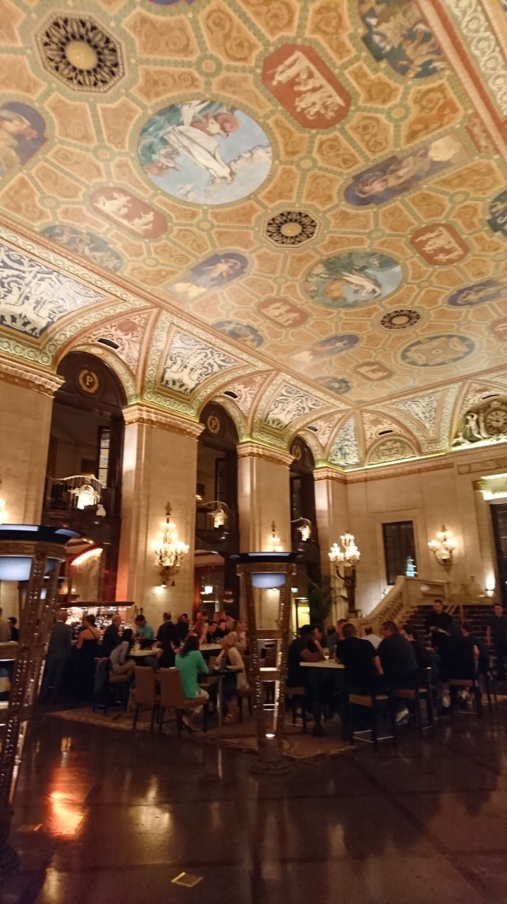 ダウンタウンのループ内にある巨大ホテル。CTA(高架鉄道)が真横に通る場所で、周辺にはコンビニ、飲食店をはじめ、大方のものが揃っており便利。100年以上の歴史を持つ建物は、外装、内装ともに、かなり改装されているものの、1875年に細見されたという古さは隠せません。しかし、その分歴史が感じられ、また、部屋、水回りの作りがゆったりしています。さらに2階のロビーの豪華さは、他のホテルのひけをとらないレベル。1873年にフランスのガガ、ルイ・ピエール・リガールが制作したフレスコ画の天井は、圧巻ものです。CTAが真横に走るので、騒々しいのではと覚悟しましたが、騒音は感じませんでした。