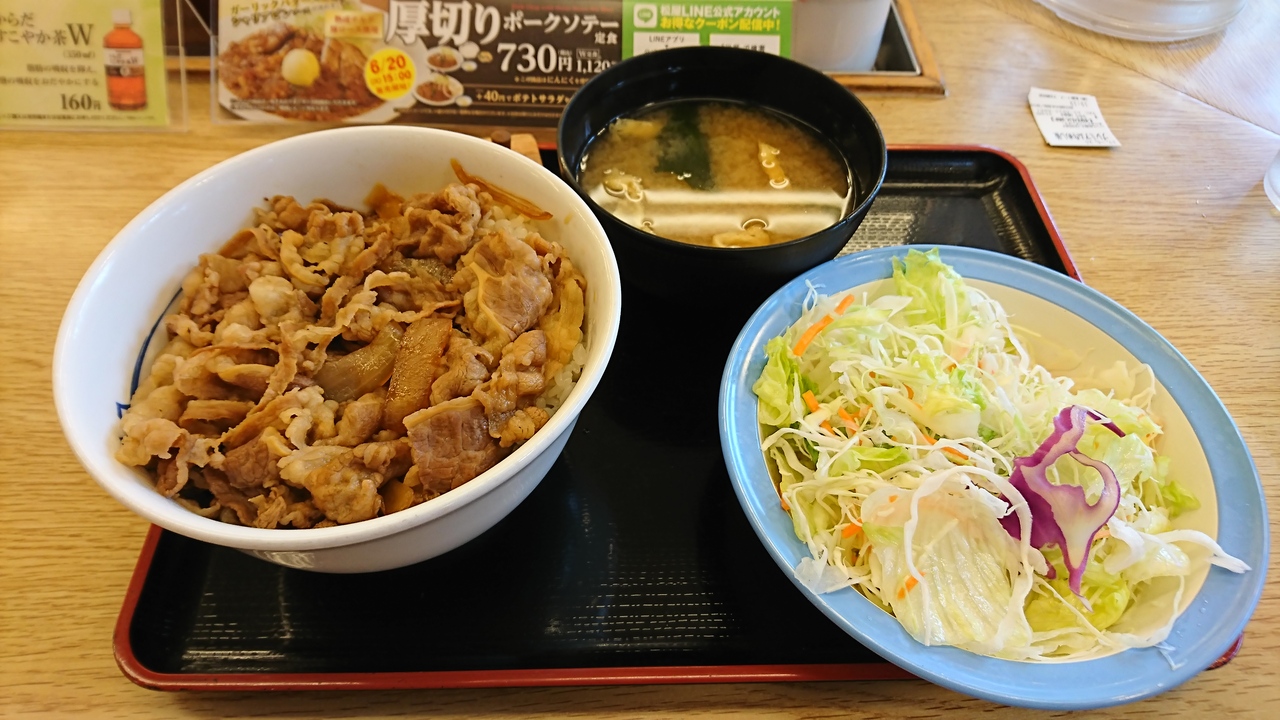 新青梅街道と千川通りが交差する井草4丁目交差点近くの千川通り沿い。井草の森公園近く。西武新宿線上井草駅から徒歩10分弱くらいの場所にあり、駐車場も3台程度はあるので、完全にドライバーや家族連れを意識。住宅街にあるので、休日はお弁当のお客さんや、ヒールを飲みながらというお客さんもいます(樽生の広告も貼ってあった。)。店内は、外観からの印象よりも広く、テーブル席が4つ。カウンターがコの字形で、高さも低い。また、チャイルドシートも完備。メニューは、他の松屋と変わらないです。