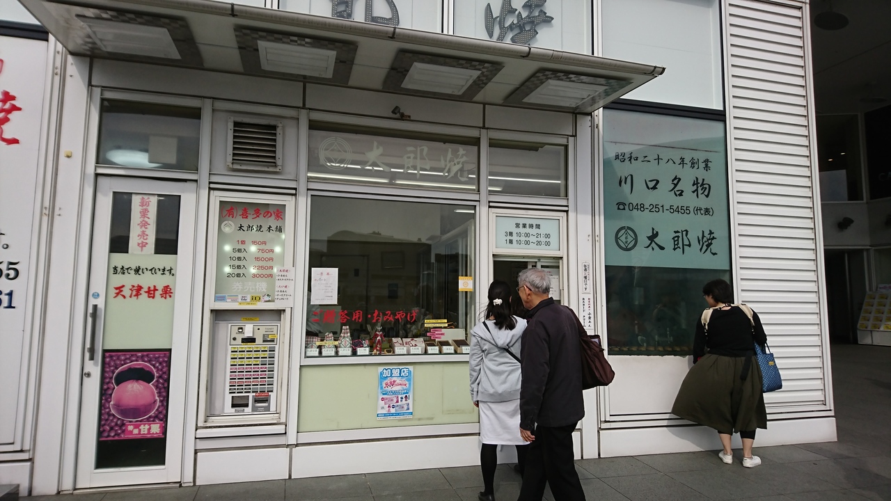 川口駅のそごうの2階入り口の隣。川口駅の改札からそのまま歩くと目の前にあります。川口の名物店で、餡子やカスタードなどの入った今川焼(これを「太郎焼」と呼ぶ)、鯛焼き、さらには餡子を売っています。作り置きをしないのか、頼んでからできるまで少し時間がかかります。注文が終わるとと一回、扉が閉められて、出来上がるとまた扉が開きます。餡子とカスタードの太郎焼を食べましたが、やはり出来立てがベスト。冷めても美味しくないわけではありませんが、出来立てのホカホカにはかないません。Suicaやnanaco、WAONなどの電子マネーも使えます。