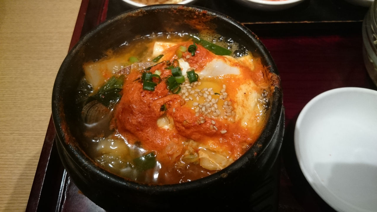 羽田空港国内線第1ターミナルの5階にある焼肉店。メニューは他のトラジとあまり変わらないようで、店の中には強力な換気装置があり、うなっています。ランチメニューは、焼肉系は、スペシャル(2100円)、ファーストクラス(2680円)、焼肉御膳(1850円)と少々高めかも(ただし、ライスとスープは食べ放題)。ビビンバセット、クッパセットが930円(税込み)で。そのほかセット系は1340円がメインで、石焼きビビンバが1450円。サラダ、スープ、3種のおかず(キムチ、チャプチェ、ナムル)か、サラダ、ライス、3種のおかずがついてきます。豆腐チゲセットを頼みましたが、グツグツ煮込まれたチゲは辛さは本格的。アサリの出汁が効いており美味。空港のレストランなので、クイックメニューがほしいところ。