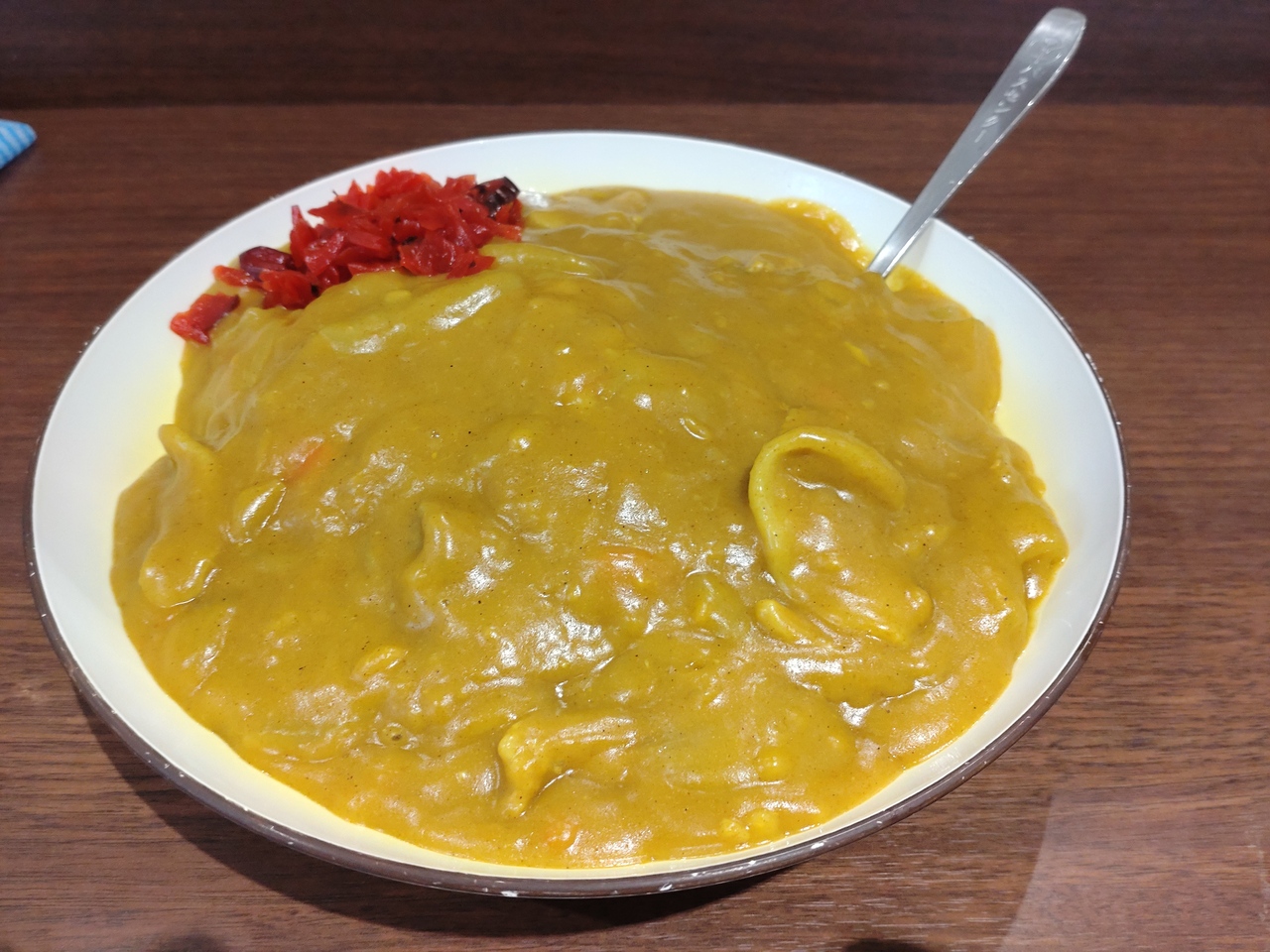 こちらのお店のカレーは、豚骨スープをベースに香り高いスパイスで風味付けをした黄色いカレーで、まずその色に驚かされる。そして少し量が多めの真っ赤な福神漬が印象的。見た目からすると甘めに見えますが、スパイスが効いていて結構辛め。玉ねぎとお肉の旨味が凝縮されていてクセになる味。ビリッとした辛さの中に甘みのある、とろみのある昔ながらの味わいが楽しめる、飽きの来ない味。