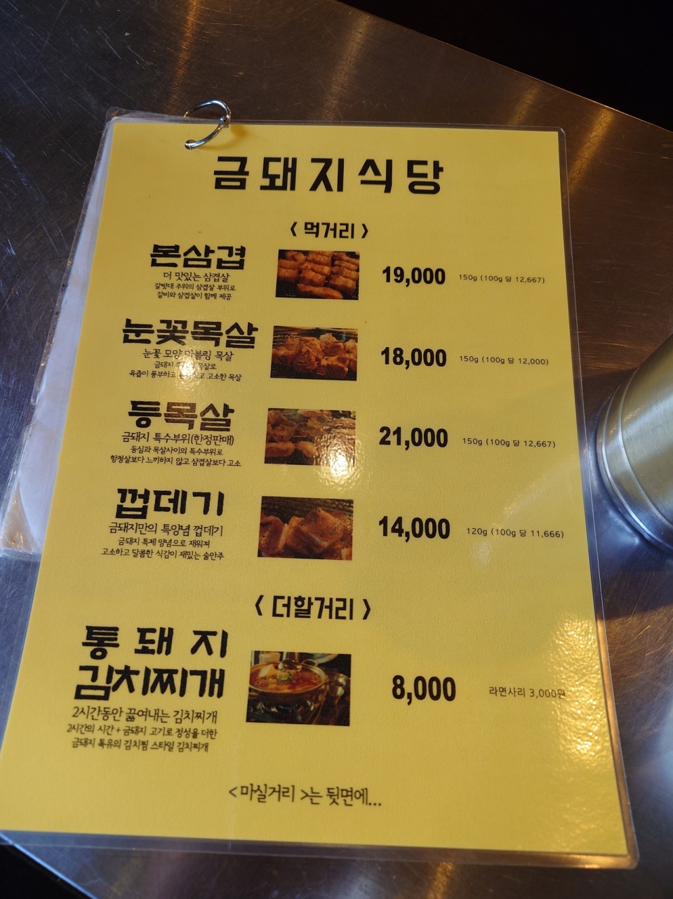 地下鉄3号線薬水(ヤクス)駅(2番出口番号)から徒歩5分くらいのところにある焼肉店。2019年以来、ミシュランガイドにも掲載されている人気店で、東方神起やBTSなど有名人も多数来店するとのこと。日本人向けのネットガイドにも多数掲載されており、日本人をはじめ外国人観光客の来店も多い。お肉は2人前からの注文となりますが、カウンター席もあるのでお一人様もOKの韓国では嬉しいお店でもあります。