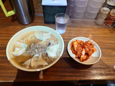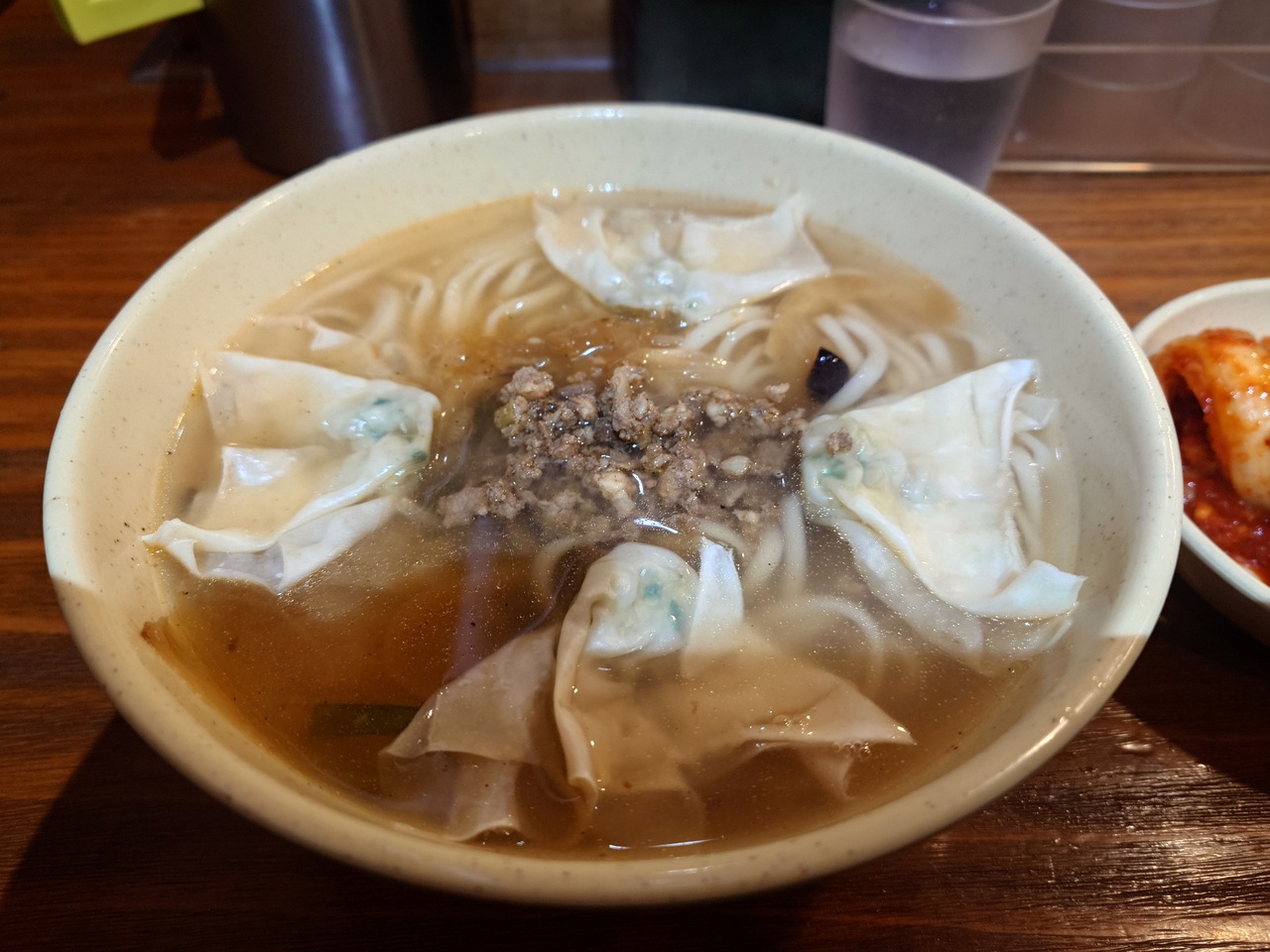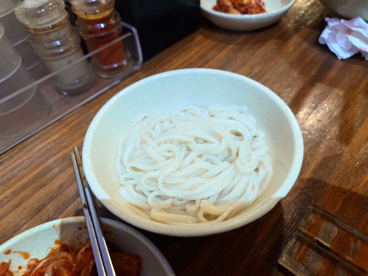 オーダー後、そう時間を置かずに提供されるカルグクスは、長時間煮込んだ鶏ガラをベースににんにくが効いた少しとろみのあるスープに、細切りのズッキーニ、玉ねぎと炒めた鶏ミンチ、ワンタンが具材となっており、味付けは日本人にも合うしっかりした味です。ツルンとした食感の日本の稲庭うどんのような細さの麺としっかり絡み、喉越しも良い。また、麺のお替り(一回だけのようです)が可能。おかわりを頼むときは「サリ リビル ヘジュセヨ」で、店員さんに頼むのが良いと思います。日本の豚骨ラーメンの替玉のような形で提供されます。このお店は、マンドゥ(韓国餃子)も名物ですが、ボリュームが結構あるので、一人で両方食べるのは、結構難しいと思います。一度食べてみたい。一緒に提供されるキムチは、韓国の一般的なキムチよりもにんにくがかなり入ったもので、酸味が少なめ。他のお店ではあまり食べたものないもので少し辛め。好みがあると思います。