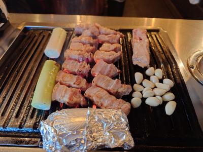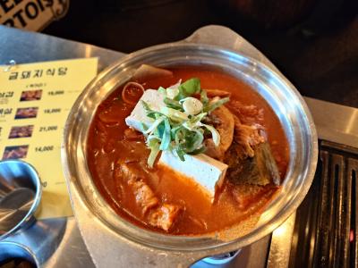 オススメは、ポンサムギョプ(骨付きサムギョプサル)とキムチチゲ。ポンサムギョプは、もちろん店員さんが焼いてくれます。脂の乗ったジューシーなお肉と骨の周りのコリコリした食感の二つが楽しめます。特製のネギだれにつけて食べるのも美味ですが、軽く塩をつけて食べるのも肉の旨みが感じられました。銀紙に包んて焼かれたエリンギもジューシーで美味。キムチチゲは脂ののった大きな豚肉がゴロゴロ入ったもので、豚肉はかなり柔らかい。チゲそのものはあっさり目の味付けで、辛味は強くない。追加でインスタントラーメンを入れることができるとのこと(お腹がいっぱいで断念)。