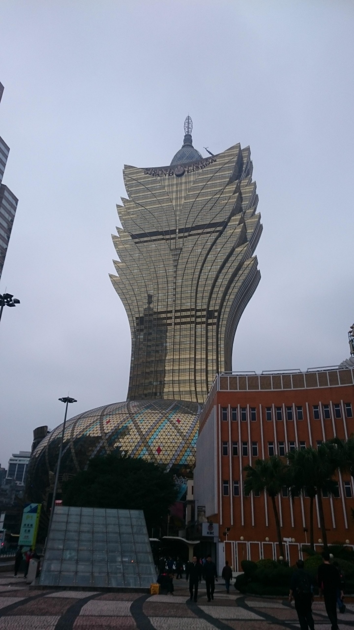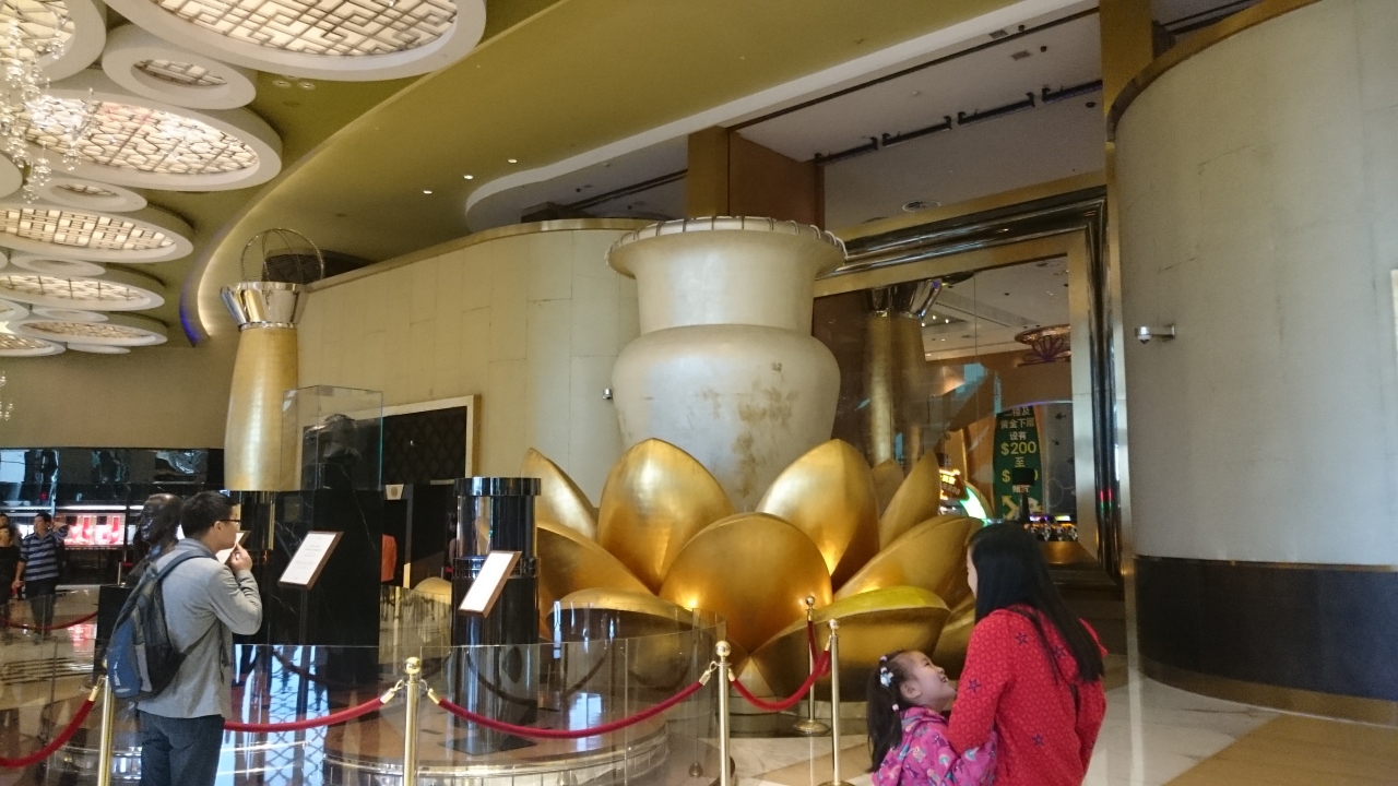 マカオを代表するカジノであり、ランドマークタワー。建物は一度見たら忘れないくらい印象的なものです。金属探知機を抜けるとカジノで、天上が高い。2階までのエスカレーターはかなりの距離があります。マカオのカジノはミニマムベッドがほかの地域よりも高めに設定されている気がしますが、サンズグループのカジノよりは少し低めからのテーブルゲームもありました。チップのサイズが他よりも大きい気がします。