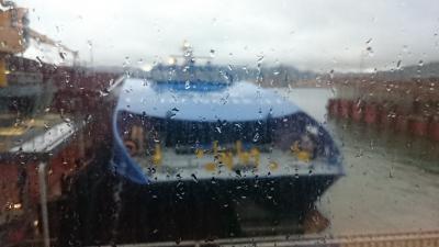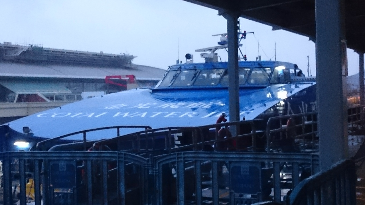 香港からマカオに行く場合、複数のルートがありますが、外港の場合はターボジェット(噴射飛航)、タイパの場合はコタイウォータージェット(金光飛航)がそれぞれ便数が多いです。真っ赤で強烈な印象の噴射飛航に対して、濃い青の金光飛航も同様に強烈な印象を受けます。船内のサービスに大きな差はありませんが、金光飛航の方が座席配置にゆとりがあり、シートも革張りでゆったりしています。また、ネット上での誕生月のチケット割引サービスがあったりと、噴射飛航よりもサービスが良いかもしれません。