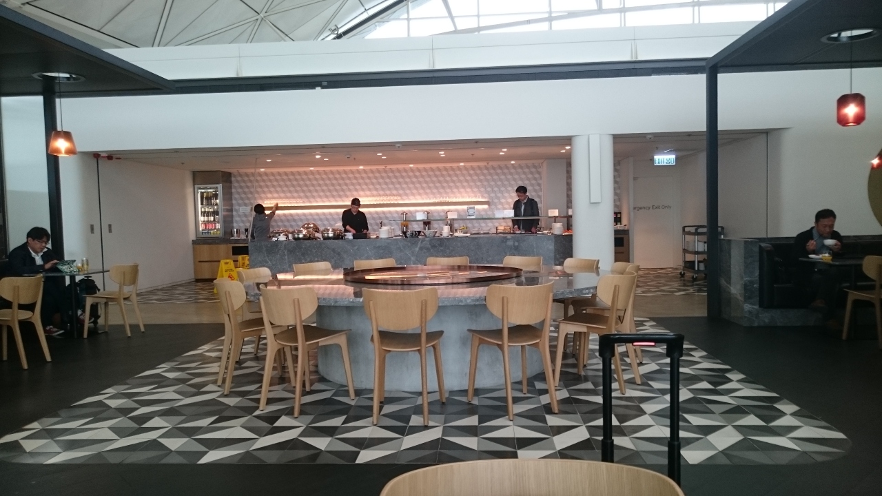2015年12月からJALのラウンジが変更されて、北ウイング7階のカンタスラウンジになりました。JAL利用客を考慮して、食事も日本食が用意されており、まぁまぁの味付けでした。焼きたてのパンは美味。ただし、JALのWebには、カレーやうどんと書いてあったのですが、午前中の便であったためか、用意はなかったです。以前のプラザラウンジとは対照的に、開放的なスペースにあるので気持ちが良いですが、逆に開放的すぎて落ち着かない気もします。プラザラウンジには、麺のコーナーがあり、香港からの帰国の時の楽しみだったので、少し残念。