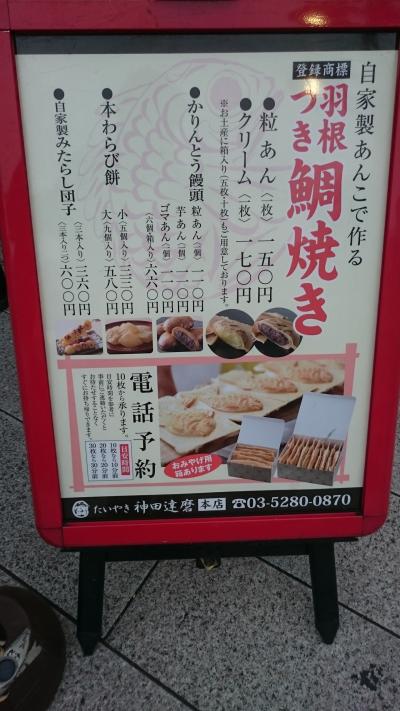 丸ノ内線淡路町駅、新宿線小川町駅出口すぐ。小川町交差点にあるビルの1階にお店を構えている鯛焼き屋さん。「羽根つき鯛焼き」という周りに羽根がついた鯛焼きか名物。パリパリで美味しいとのことで並んでみましたが、その場で食べないとパリパリ感は味わえない模様。思ったよりも羽根の生地も厚いので、すぐ水分を含んでしまいます。「尻尾まで餡子」ではないので、餡子の量を見ながら、うまく食べないと最後まで美味しく食べられません。餡子はつぶ餡で甘さはちょうど良かったです。持ち帰りは、オーブンで温めろと書いてありましたが、なかなかそうもいかないかと。