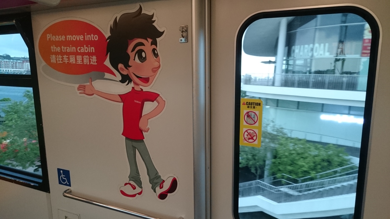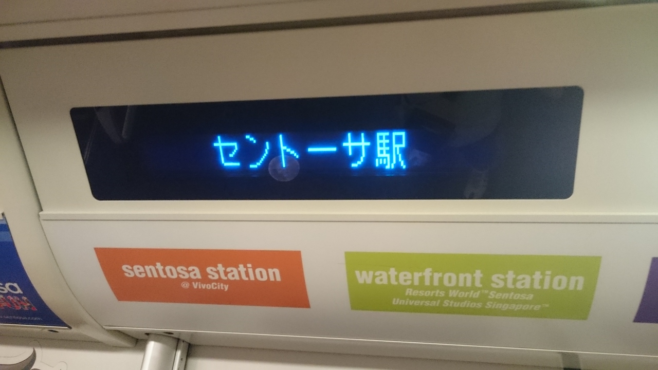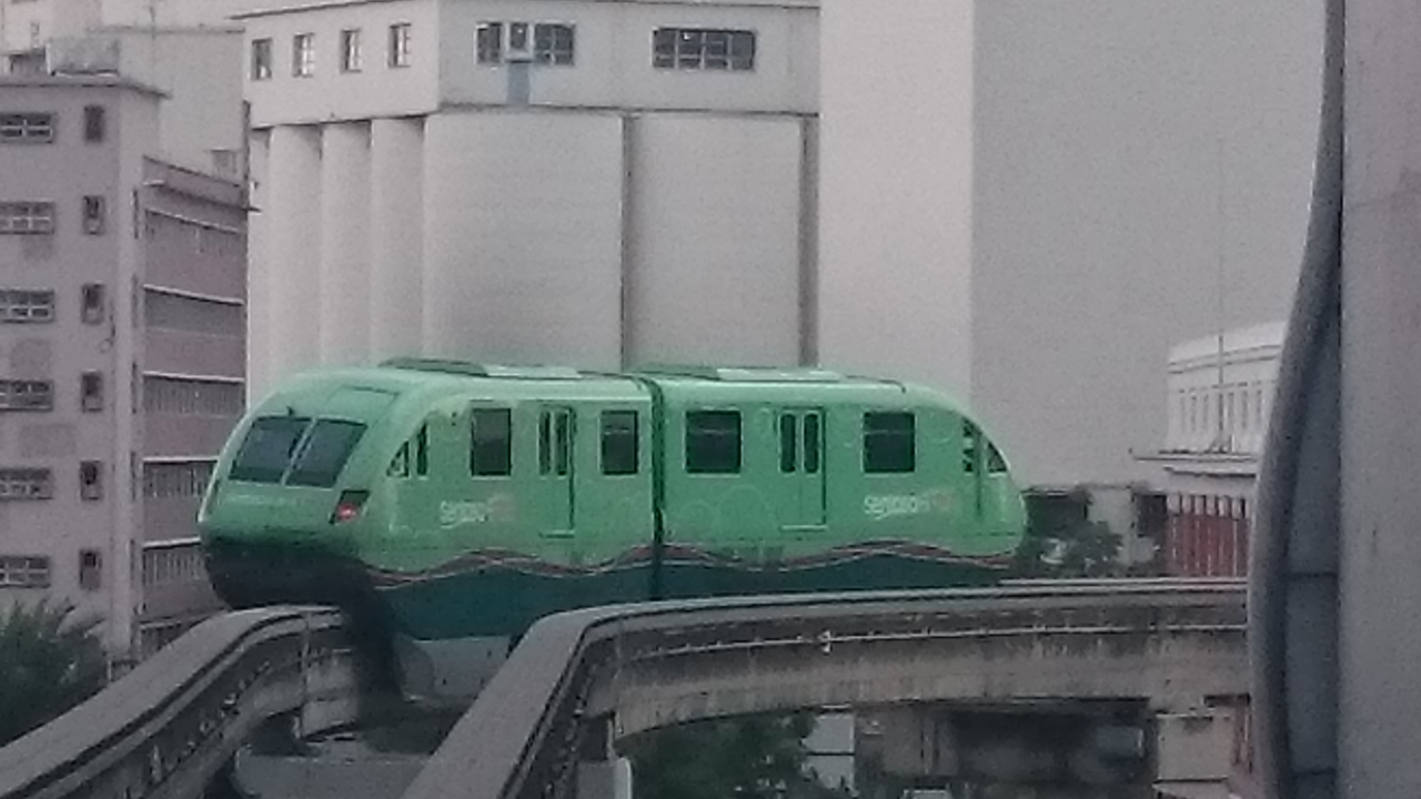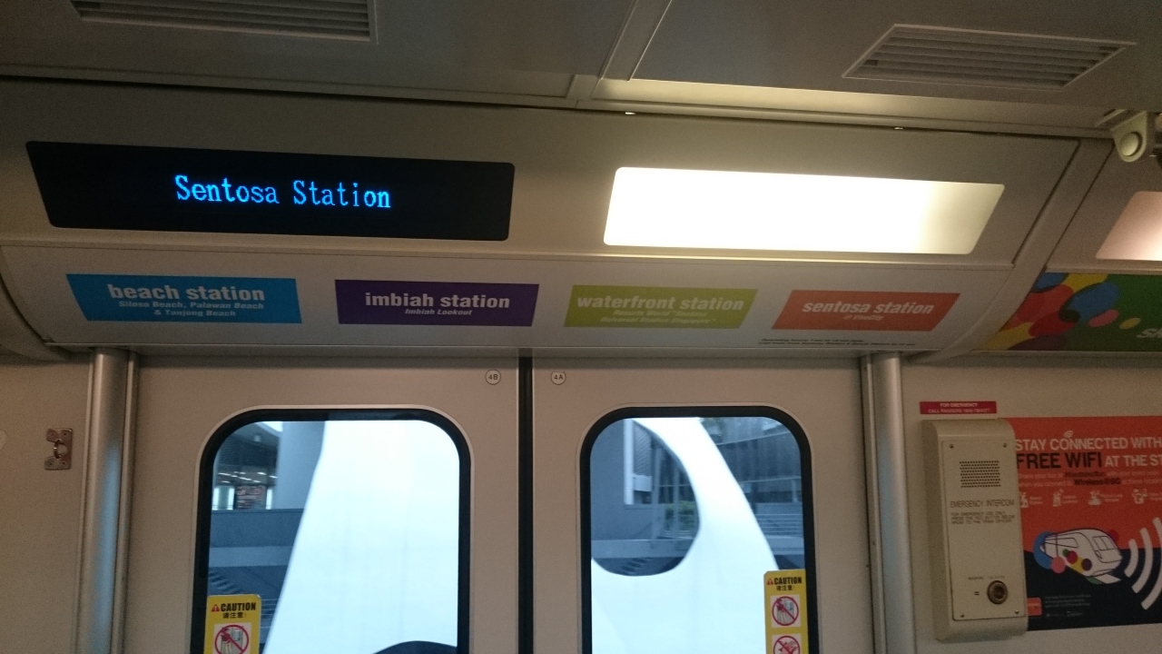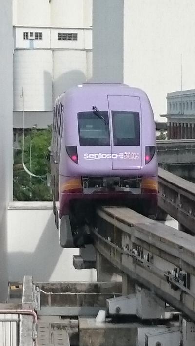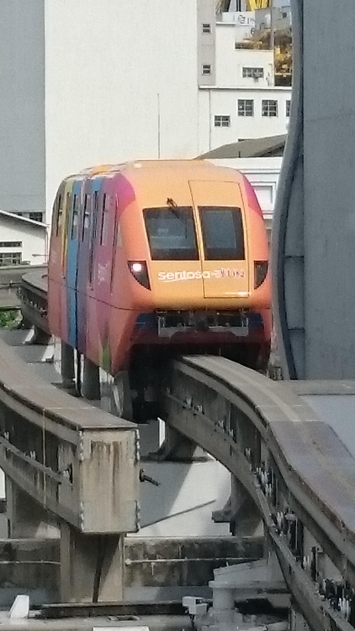 シンガポール島とセントーサ島を結ぶ交通機関で、日立の跨座式モノレールです。起点の Sentosa駅はMRTのハーバー・フロント駅のショッピングセンターVivo Cityの3Fにあり、広いロビーのような場所に、セントーサ島の案内所のようなところで切符を買います。乗り場はその端にあります。途中、カジノやユニバーサルスタジオのあるWaterfront駅、マーライオンのあるImbiah駅の二つ駅があり、終点のBeach駅になります。Sentosa駅以外切符売り場や改札口はなく、島内では乗り放題です。車両の色はすべて異なり、日本ではあまり見られないパープルやピンク色のモノレールもあります。海を渡る時は両側の風景を楽しめ、乗車時間は数分ですが、飽きることはありません。車内には日本語の表示もあります。途中駅から乗る場合、混雑していると小人数しか乗れないので、結構、乗るまでに時間がかかります。