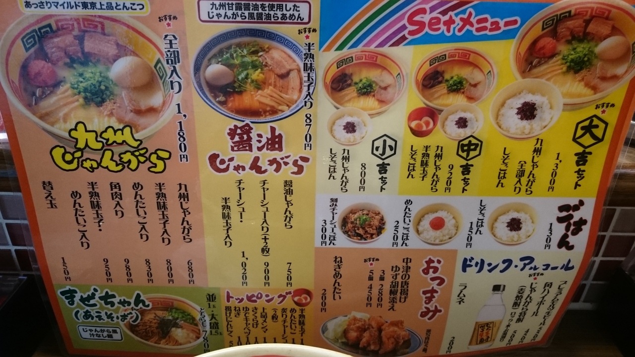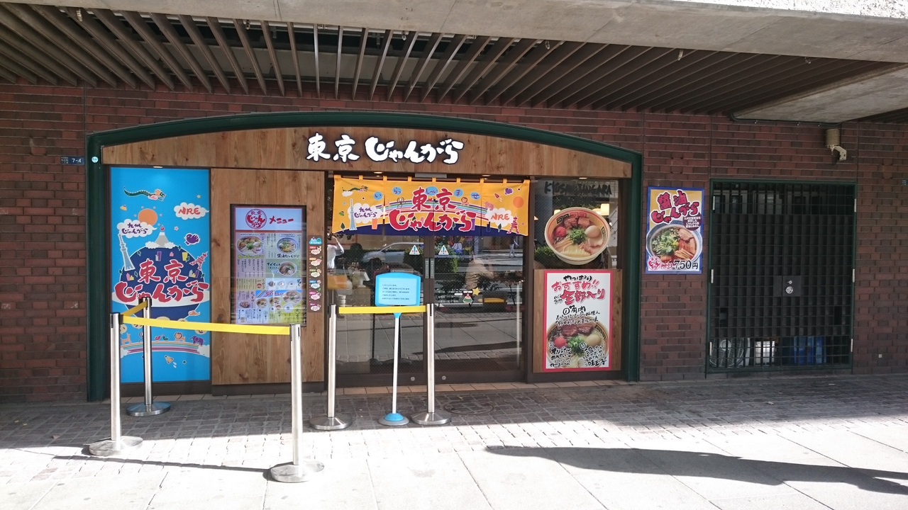 丸の内北口の中央線の高架下の味の散歩道に開店したじゃんがら。お店の名前が「東京じゃんがら」という通り、「九州じゃんがら」とは経営体が異なり、駅構内などに出店しているお店の形態とのこと。メニューはあまり変わらず、九州じゃんがらを中心に、醤油じゃんがら、まぜちゃん(油そばみたいな)、ご飯とのセット、おつまみ(から揚げ)、お酒(生ビールあり)、九州じゃんがらのノーマルが680円で替え玉が150円、全部のせだと1180円だから、サラリーマンのランチには少し高め。からしタカナと紅しょうがは入れ放題。麺の硬めを頼みましたが、開店して間もないので慣れていないののか、あまり硬くはありませんでした。お店はカウンター中心にテーブル席も2名と4人がけがある。SUICAやPASMOの利用可能。昼時は混雑しますが、時間を少し外せば空いています。