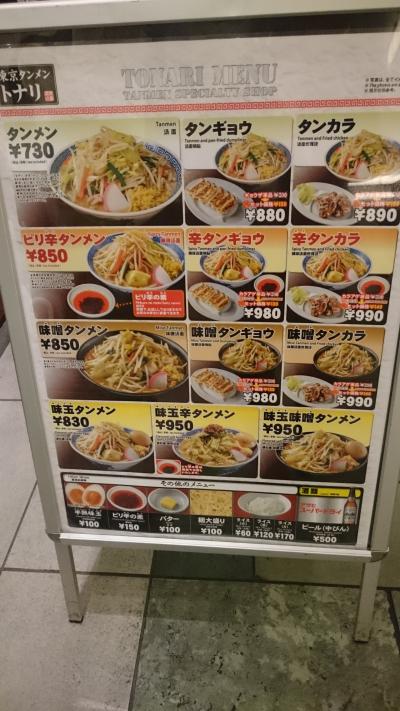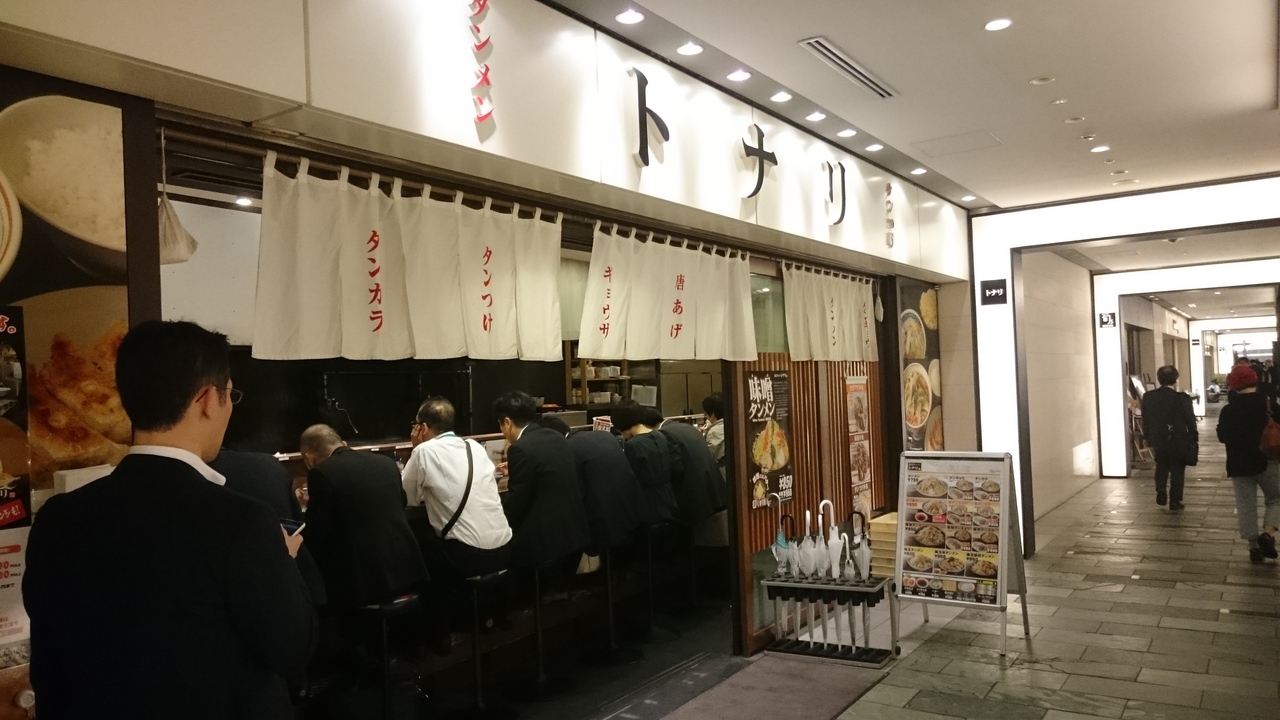 丸ノ内のTOKIAの地下のレストラン街にあるお店。東京駅八重洲のラーメンストリートのお店とは異なりこちらはカウンターのみ。細長いお店と言う印象。こちらは注文式で、食べた後に支払う方式。野菜不足だなぁと感じるときにいいお店で、これでもか、というくらいの野菜が入っています。生姜を入れますか、と聞かれるのは他のトナリと同じ。入れるとパンチが効いて美味。麺は平打ち麺でスープとの相性は良いです。スープは白く濁ったタイプの塩味で、ゲソからもいい味が出ています。タンメンと餃子のセットの「タンギョウ」かから揚げとセットの「タンカラ」でいつも迷います。八重洲のお店よりも何となく雰囲気があり、カウンターのみと言うこともあり、ラーメンに集中できる気がします。