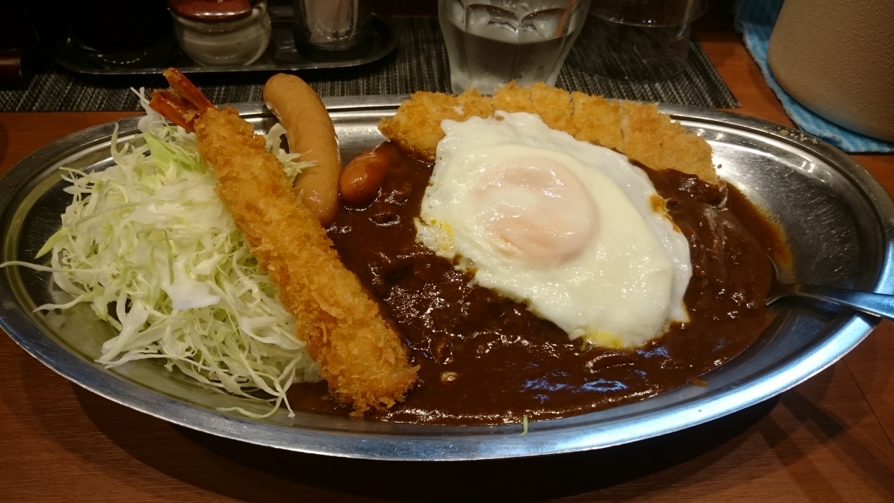 金沢(お店では加賀カレーと表記)カレーの有名店で小松に本店のある「カレーの市民アレバ」の東京や横浜などで展開するチェーン展開しているところの本店。こちらのカレーは他の金沢カレーほどどろっとしておらず、辛さは最初がマイルドで、後から辛さがくるタイプ。オススメは、エビフライ、ウインナー、カツ、目玉焼きのっており、ご飯も大盛り。カツもエビフライもサクサクでした。キャベツの大盛りやお代わり無料です。