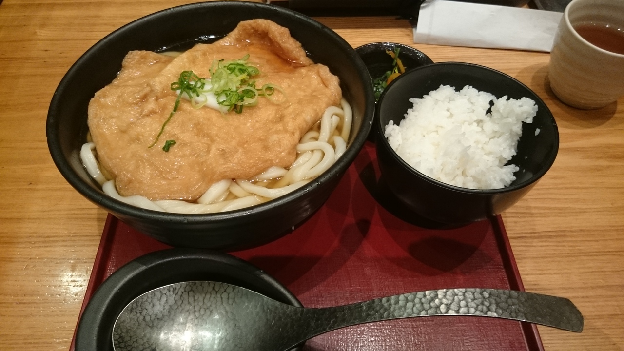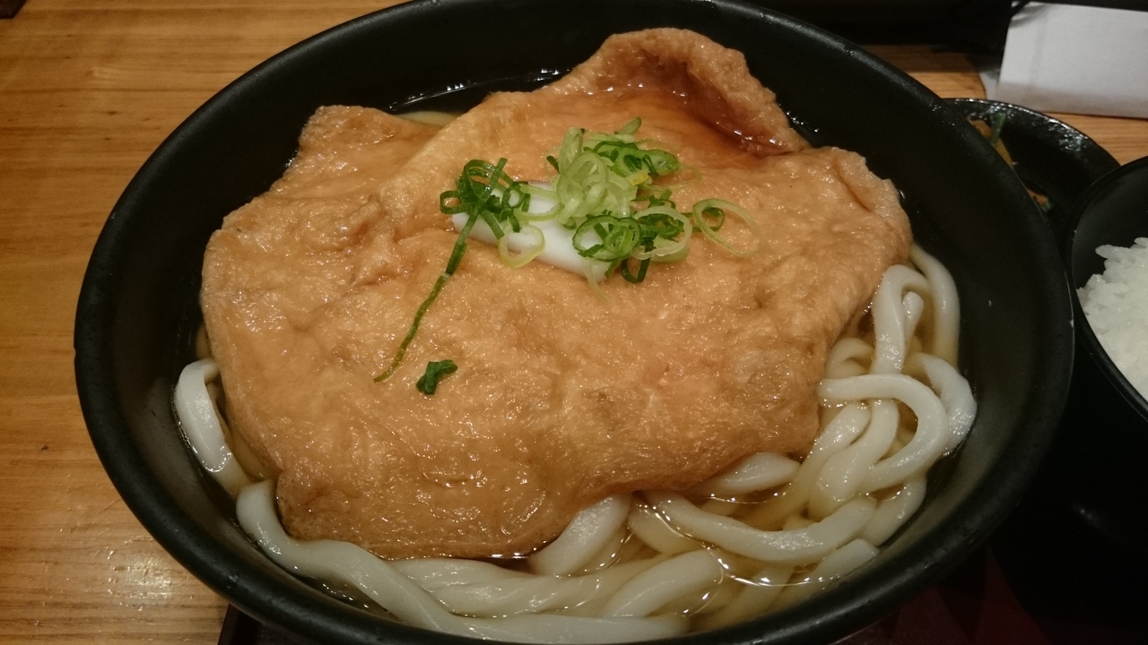 TOKIAの飲食店街にあるうどん屋さん。こちらは関東や讃岐うどんではなく、出汁を効かした本格的な大阪のうどんが食べられるお店で、「おうどん」という方が似合う。昼時は並ぶのを覚悟しなくてはなりませんが、時間を外せば、列も短くなり、そう待たなくても大丈夫でした。うどんの出汁は昆布と鰹からとった白い出汁がベース。うどんはツルツルで腰のあるタイプ。うどんの量が一玉から半玉刻みで三玉まで選べるのが嬉しい。大阪のうどんといえば、「きつねうどん」。お揚げか器いっぱいくらいの大きさのものがどーんと一枚入っていて、甘く煮てあってお出汁との相性は最高。うどんが見えません。また、うどんは、冷や麦くらいの細さの麺か普通の麺が選べます。オススメを、聞いたところ普通の麺とのこと。メニューには、うどんのほか、天ぷらや巻き寿司、わらび餅などもあり、夜、飲むこともできます。また、ランチセットにはご飯と小鉢がついてきます。