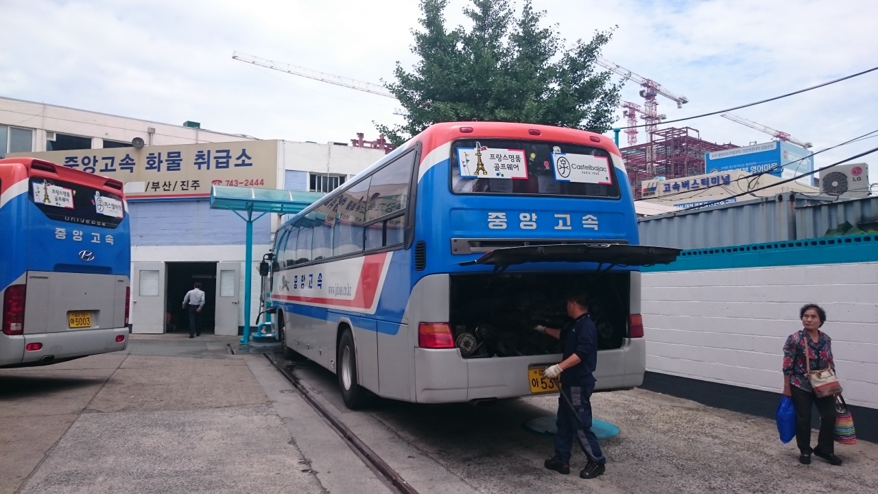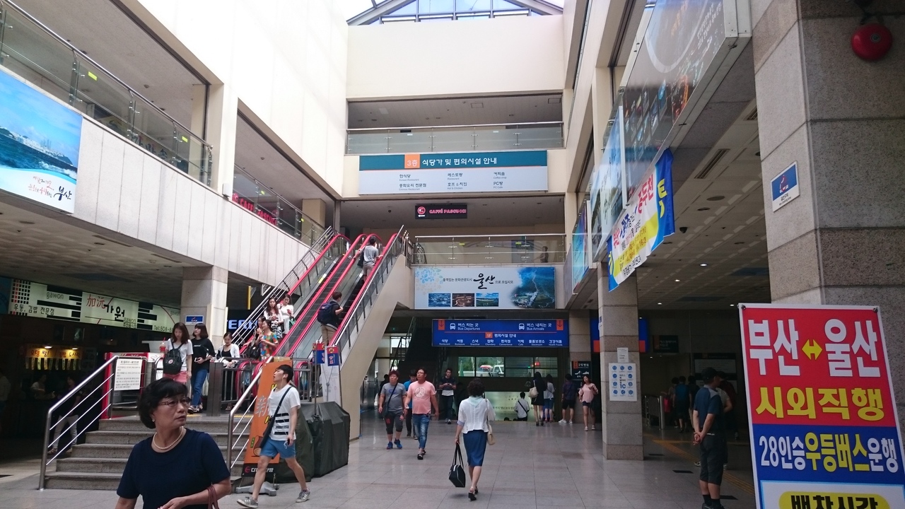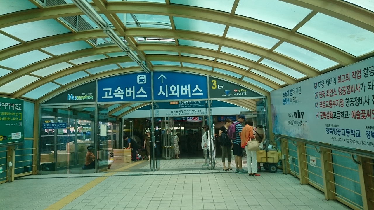 釜山の2つある高速バスターミナルのうち、釜山総合バスターミナルは、韓国の主要都市を結ぶ路線が発着しており、地下鉄1号線老圃駅と直結しています。市内の外れにあり、西面や釜山駅からは30分以上かかりますが、高速道路の近くにありので、市内の渋滞を避けることができるというメリットがあり、もう1つの高速バスターミナルである西部バスターミナル発着路線に比べて、目的地に速く着くことができます。行き先によってチケットの窓口が異なるので、まずは行き先を確認する必要があるのですが、表記がハングルしかないのが問題。行き先のハングルを用意しておくと便利です。バス乗り場はチケット売場から1階下がったところにあり、高速バス乗り場の先に市外バス乗り場があります。飲食店やコンビニ、銀行など、旅の準備に必要なお店もだいたい揃っています。