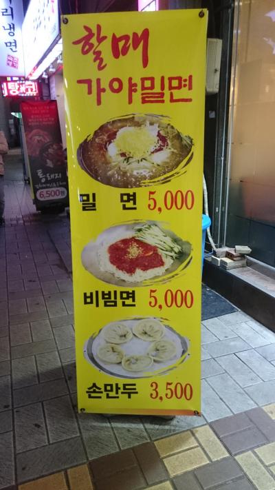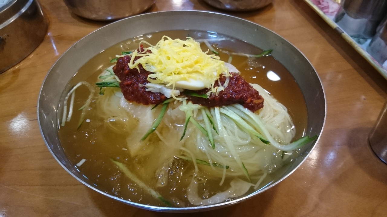 地下鉄1号線の南浦駅から徒歩5分くらい。少しわかりにくい場所にあります。店に入るとすぐにスープ入りのやかんが運ばれてくる。お肉の出汁がしっかり出ていて美味い。これを雑炊にしたいくらい。ミルニョンは、黄色のラーメンのような麺で、冷麺よりも柔らかく、喉ごしがよく、日本人向き。最初にハサミで数カ所切る。スープは漢方のほのかな臭いがする点が他のミルニョンのお店とは異なります。赤いタレは見た目ほど辛くはありませんが、最初から混ぜてしまうとだしの味がわからなくなるので、食べながら混ぜていくと良い。変化をつけたい場合は、マスタードをいれても良い。マンヅゥこと韓国の餃子は日本で食べる餃子とあまり味も変わらず安心できる。大きさがでかく、中にはおにやニラ、春雨が入っている。5個は多すぎ。
