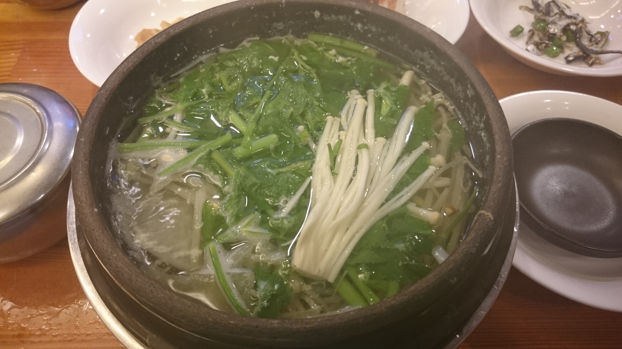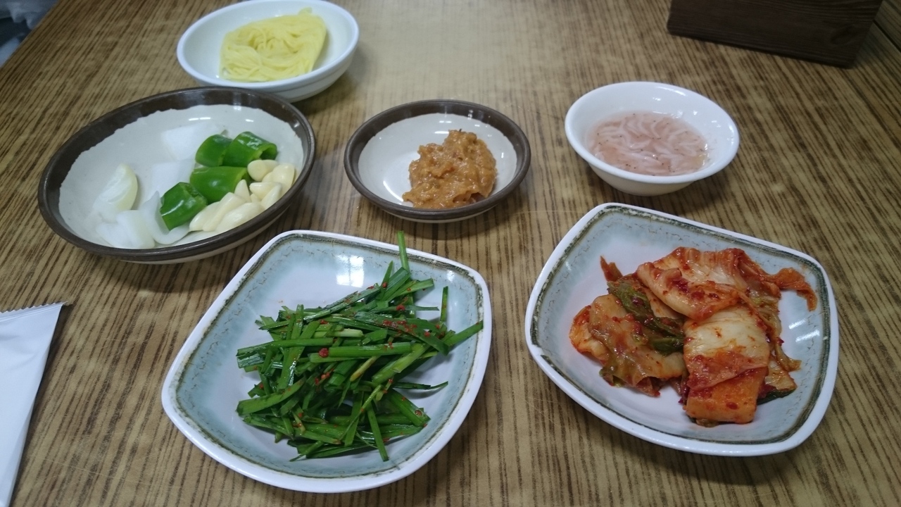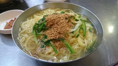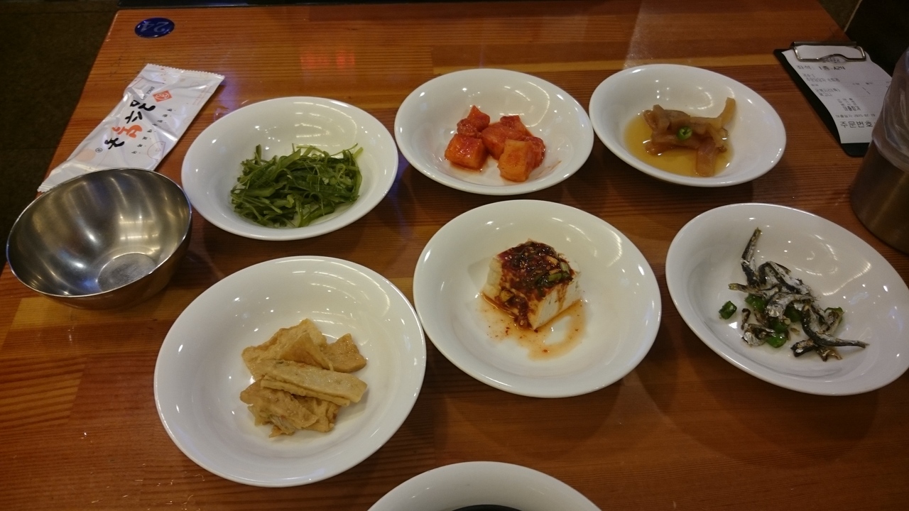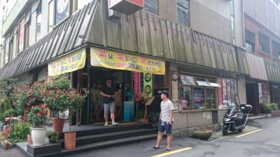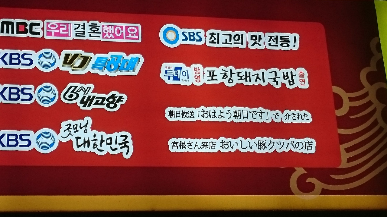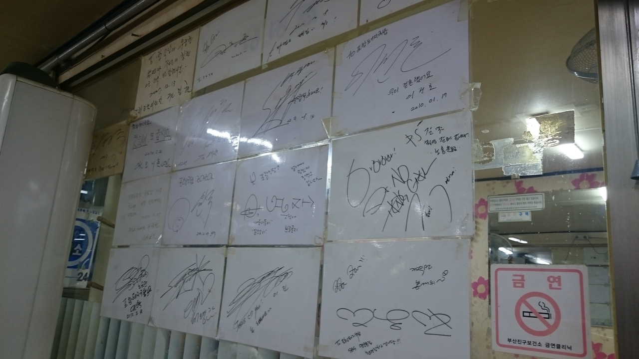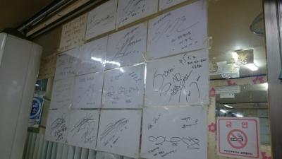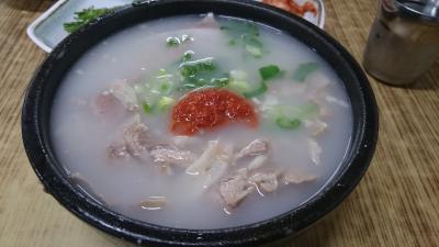 釜山といえは、豚肉のデジクッパ。西門のロッテ百貨店、ロッテホテルから通りを挟んですぐ、西門市場の裏にある通りには多数のデジクッパのお店が並んでいます。中でも一番の老舗がここ。6000ウォンのデジクッパを注文すると、まずキムチやニラの和え物、塩辛などが運ばれ、直後にグツグツ煮立ったデジクッパが運ばれてきます。お客が日本人とわかると、赤い唐辛子のようなものをいれてよいか、と聞かれます(勿論入れました)。予想以上にお肉の入ったデジクッパは、かなりの時間煮込まれているようで、しっかりと豚肉のあじかでていますが、脂っぽくなく、臭くもありません。肉は見た目よりも柔らかく、ちょうど良い柔らかさです。ニラを入れるとアクセントになって良いです。味付けは、塩辛で徐々に行って行けば良いと思います(入れ過ぎると、塩辛いので注意)。お酒を飲みながら、食べている人もたくさんいました。店内にはたくさんのサイン(ハングルなので、よくわからない)が貼ってあり、人気店のようです。これまで紹介されたテレビ番組が看板に書いてあり、「おはよう朝日」の司会者の頃の宮根さんも訪問したようでした。
