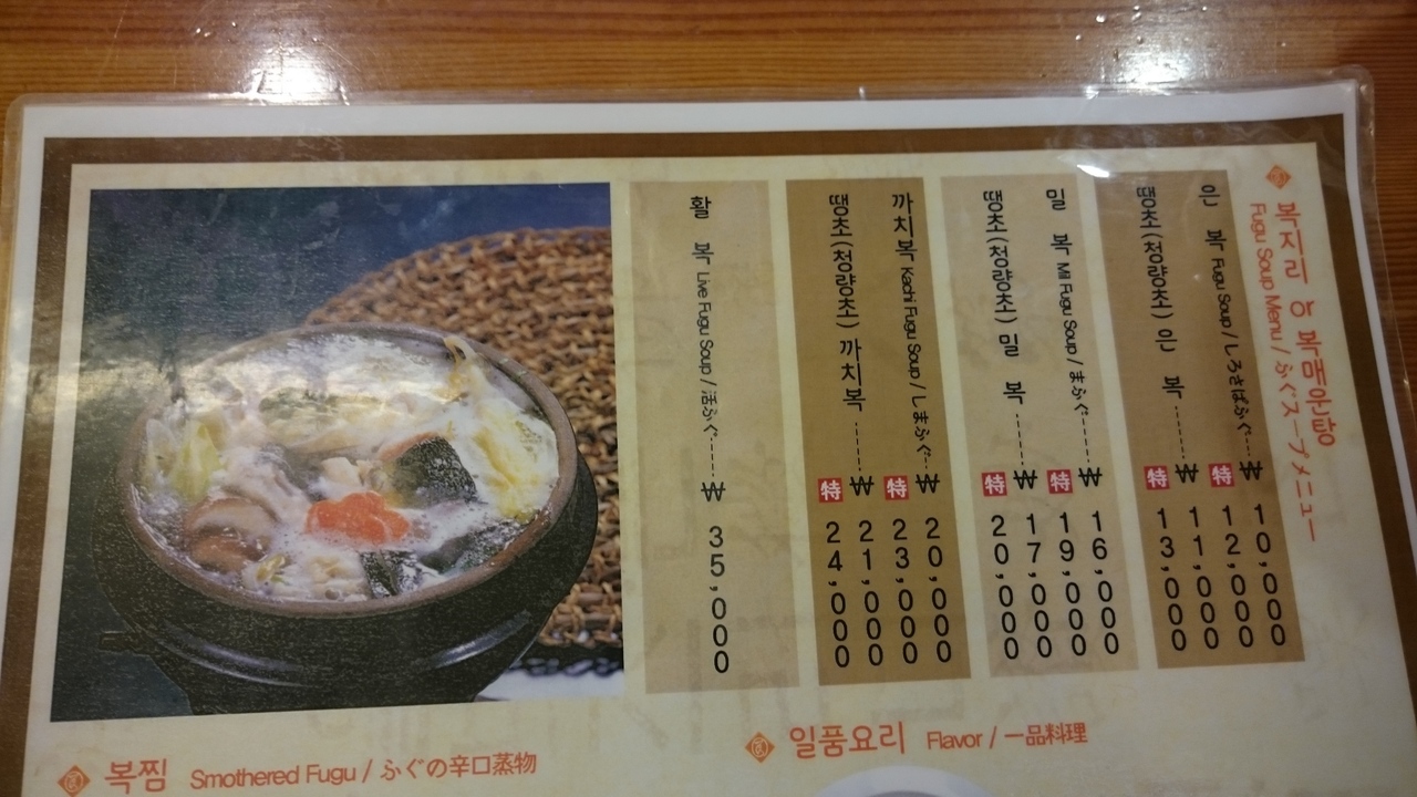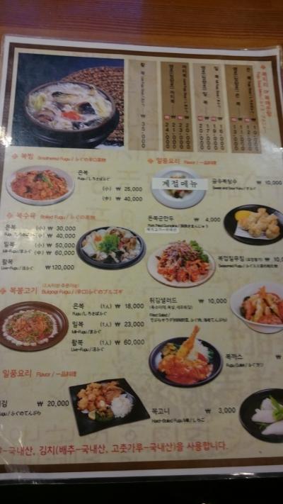 海雲台のパラダイスホテルや東横インから徒歩5分弱。地下鉄2号線海雲台駅から徒歩10分。釜山の有名店で、24時間営業。季節を問わずふぐちりが食べられます。リーズナブルなさばフグ、少々高めの間ふぐなど、フグの種類によって値段が異なりますが、一番安いさばフグのスープ(ふぐちり)は10000ウォンから、シラコは3000ウォンからという日本では考えられない価格です。辛いタイプもありますが、日本人に合う塩味だけのものが普通です。一人前ごとに煮立った鍋が運ばれて来るので、一人でも大丈夫です。スープの中には、ふぐのほかエノキ、春菊、さらにはふぐの出汁をしっかり吸ったもやし、大根が入っており、これも美味。淡白な味なので、ふぐの味に少し飽きたら、備え付けのチリソースやレモン汁につけるとまた美味でした(日本人としては卵を溶いて、雑炊にしたいところ)。このほか、ふぐ入りのビビンバやふぐカツ、少々高いですがふぐ刺しやふぐのおすしなどもありました。夏でもエアコンがフル回転しているので、熱いふぐちりを十分堪能できます。