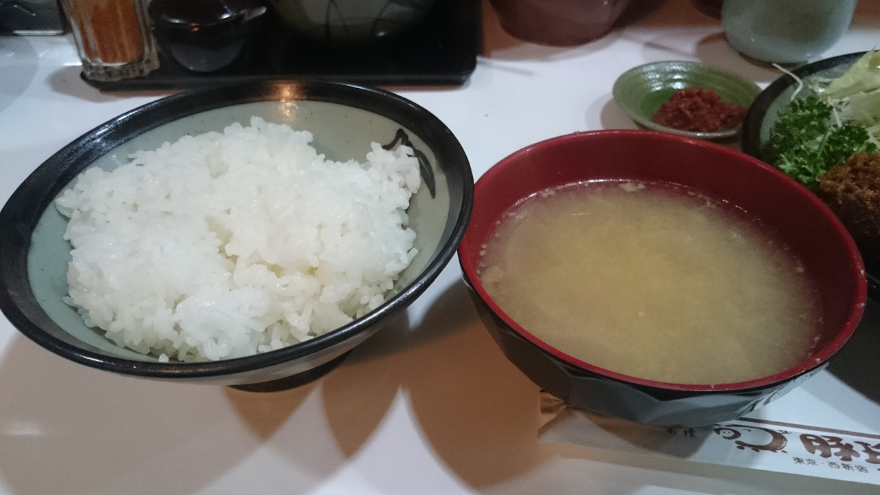 新宿西口のヨドバシカメラからゆ都庁よりにある。急な階段を登った2階にあるお店です。まずお店に入ると名物の店員さんに注文を聞かれるので、お店に入る迄に、何を頼むかを決めるのがルール。席には予め、お茶と漬物が用意されていて、席につくと直ぐにカツが運ばれています。このお店のカツは分厚い。普通のカツの1.5倍くらいはあるくらいの豚カツは、柔らかくてジューシーです。しかも値段が900円と、1000円でお釣りがきます!ジャンボメンチカツ、ロースカツ、名物のかみかつなども多数オーダーされていました。ご飯と豚汁はおかわりし放題なのも嬉しいです。