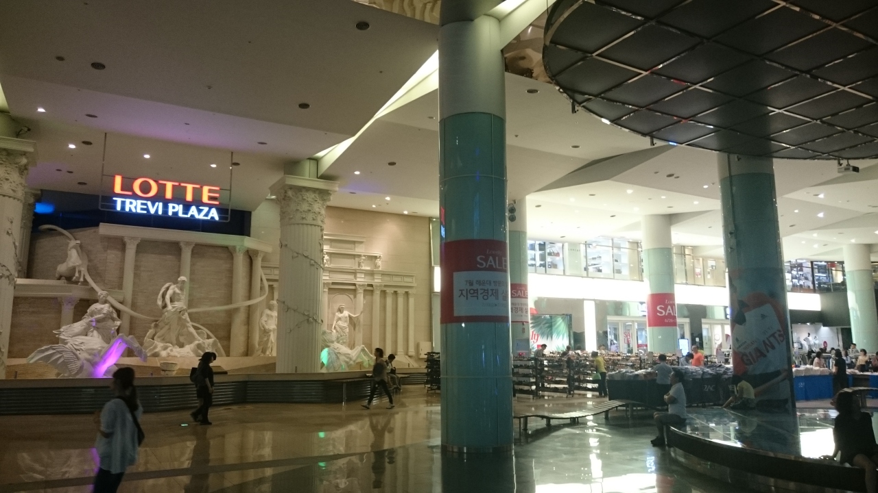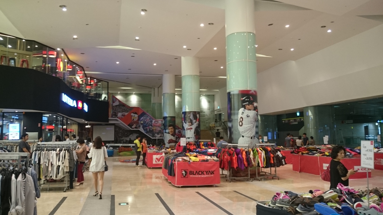 センタムシティというと世界最大規模の百貨店の新世界百貨店を思い浮かびますが、そのお隣がロッテデパートで、センタムシティ駅を降りると右側になります。店舗入り口は、他のロッテ百貨店と同じく、噴水があるなど高級感があり、釜山はロッテジャイアンツの本拠地であることからか、入口の柱には多数の選手のポスターが飾られています(マスコットは千葉ロッテマリーンズと同じようです)。西門の釜山本店よりも規模が小さく、釜山市内の他の店舗と違いを出すためか、大衆向けのデパートというよりは、高級志向を強めた印象です。地下2階は地下鉄駅と結ばれており、アイスクリームの31やロッテリア、サンドウィッチやオムレツなどの軽食のレストランや特別セールのイベント場などがあります。地下1階にはフードコート、6階にはレストランがあります。