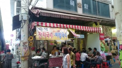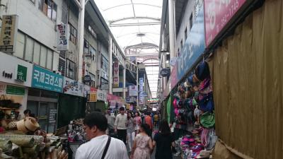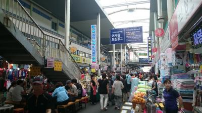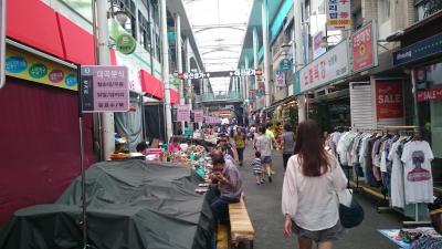2015年6月に開業した3号線(通称大邸モノレール)により最寄駅が市場の入口の目の前になり、ますます便利になりました。ソムンシジャン(西門市場)の歴史は挑戦時代までさかのぼると言われる大型市場で、5つの地区とそのほかの商店街に分かれています。飲食エリアが充実しているのがこの市場の特徴で、カルグクス(うどん)や大邱名物チムカルビ(激辛のカルビ煮込み)、ナプチャクマンドゥ(ぺちゃんこ餃子)、韓国おでん、ホットクなどさまざまな種類が揃っており、昼間から酒を飲みながらおかずをつまんでいる人もいました。もともと大邸は繊維産業で栄えたこともあって衣類や生地のお店が多いのも特徴の一つです。ソウルや釜山に比べて観光化されていないので、韓国の地元の人の生活が垣間見れるようです。