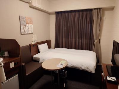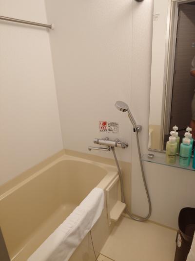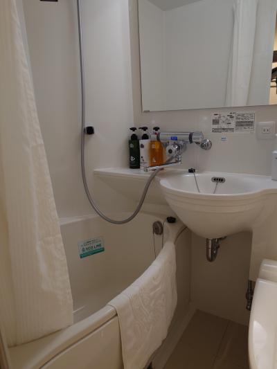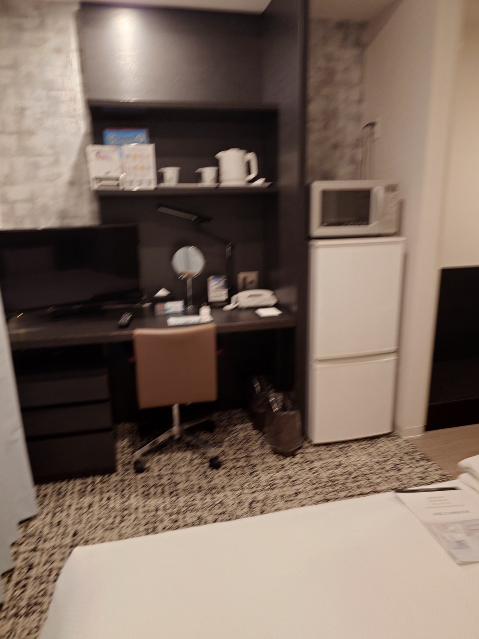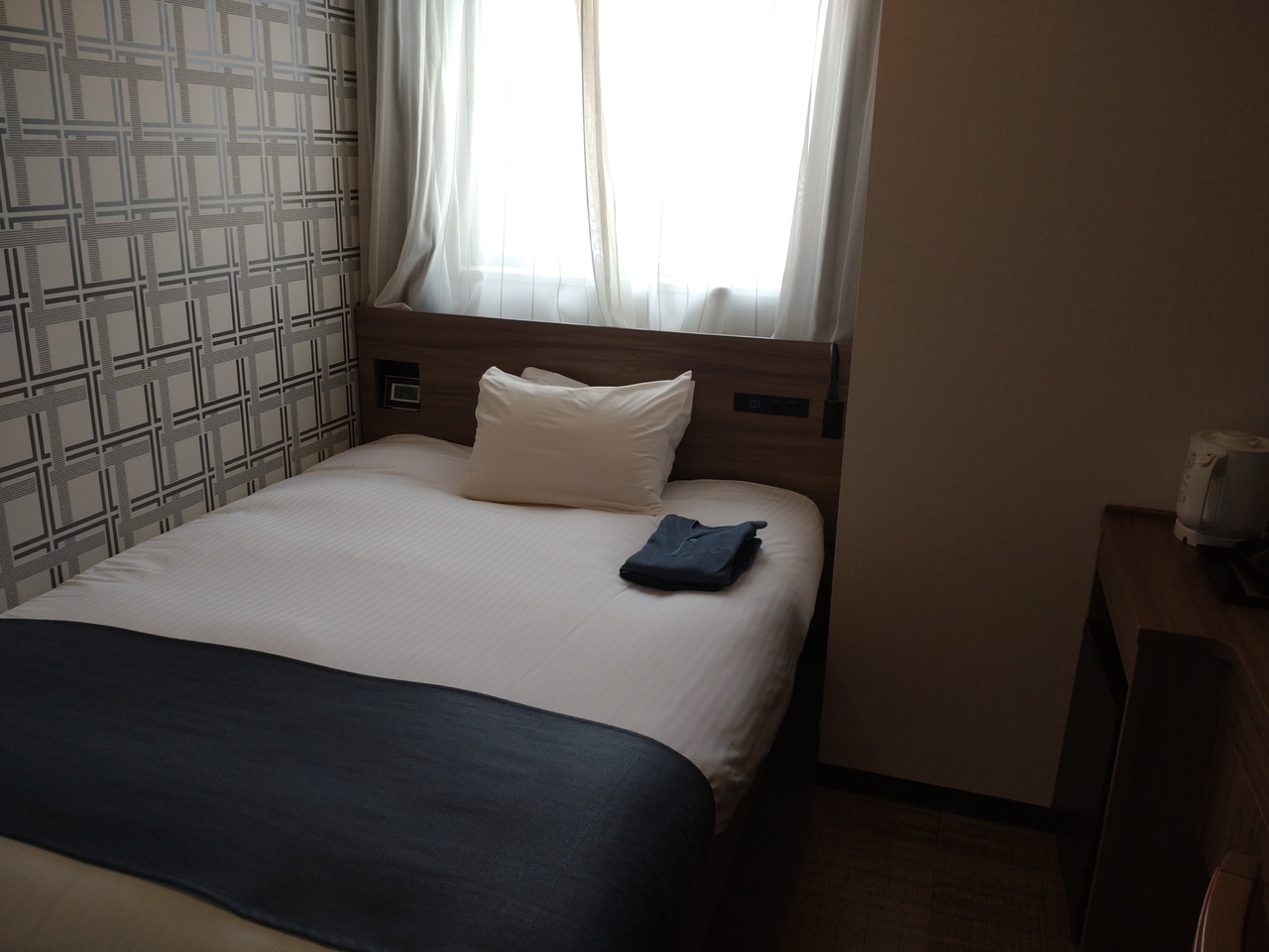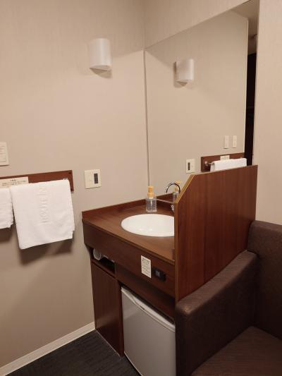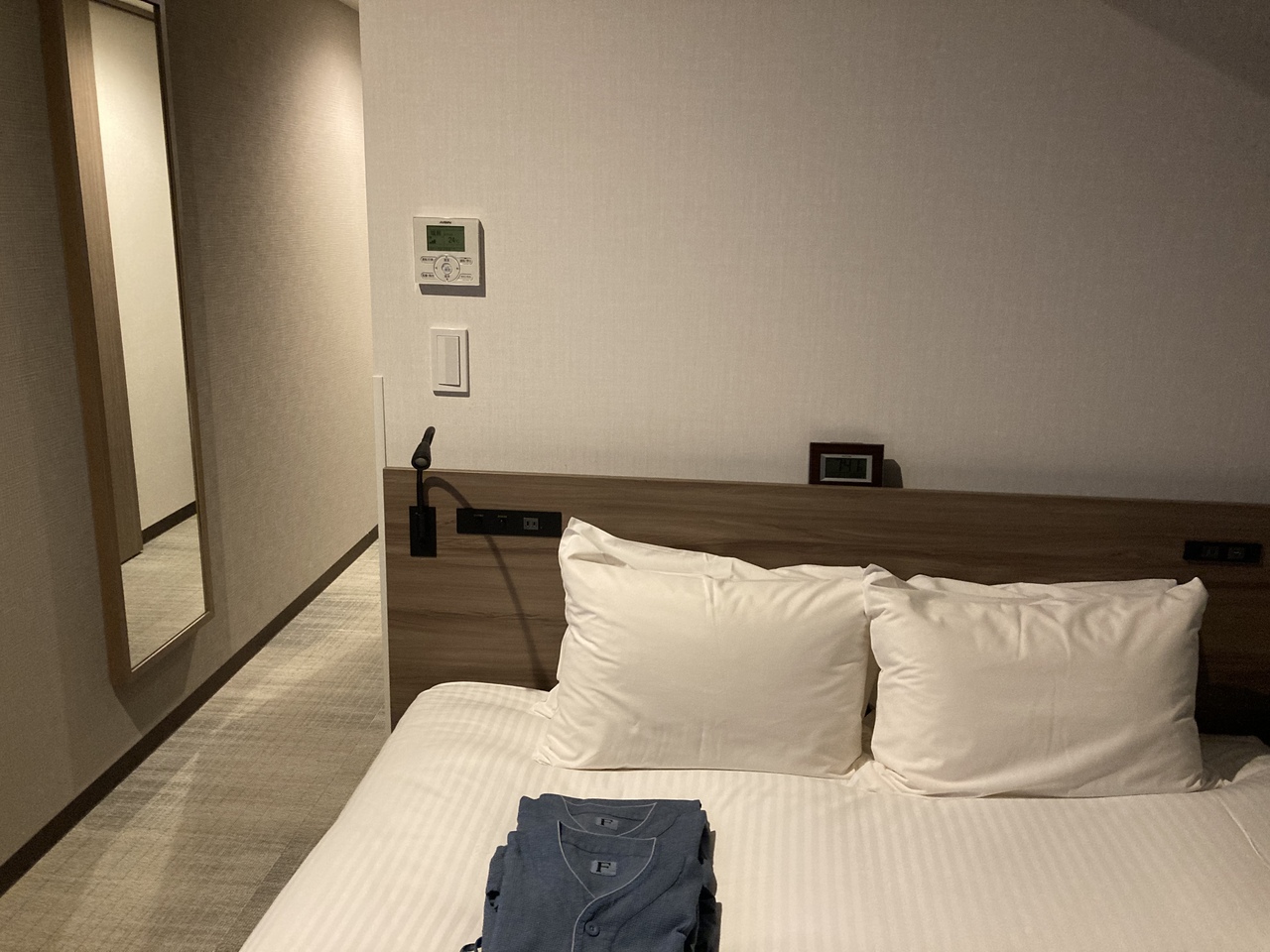 部屋はプレミアムダブルルームで広々。シモンズ製のベッドは心地よい眠りを誘う。冷蔵庫は中型サイズ、電子レンジもあり、ホテルの部屋というよりは、アパートの部屋のようでした。バスルームは洗い場付の独立したもので、家の感覚でお風呂に入ることができるのは嬉しい。洗面台はシャワー付きの蛇口で、家の水回りのようでした。机もまだまだの広さで、USB付の電源タップがあったのは便利。