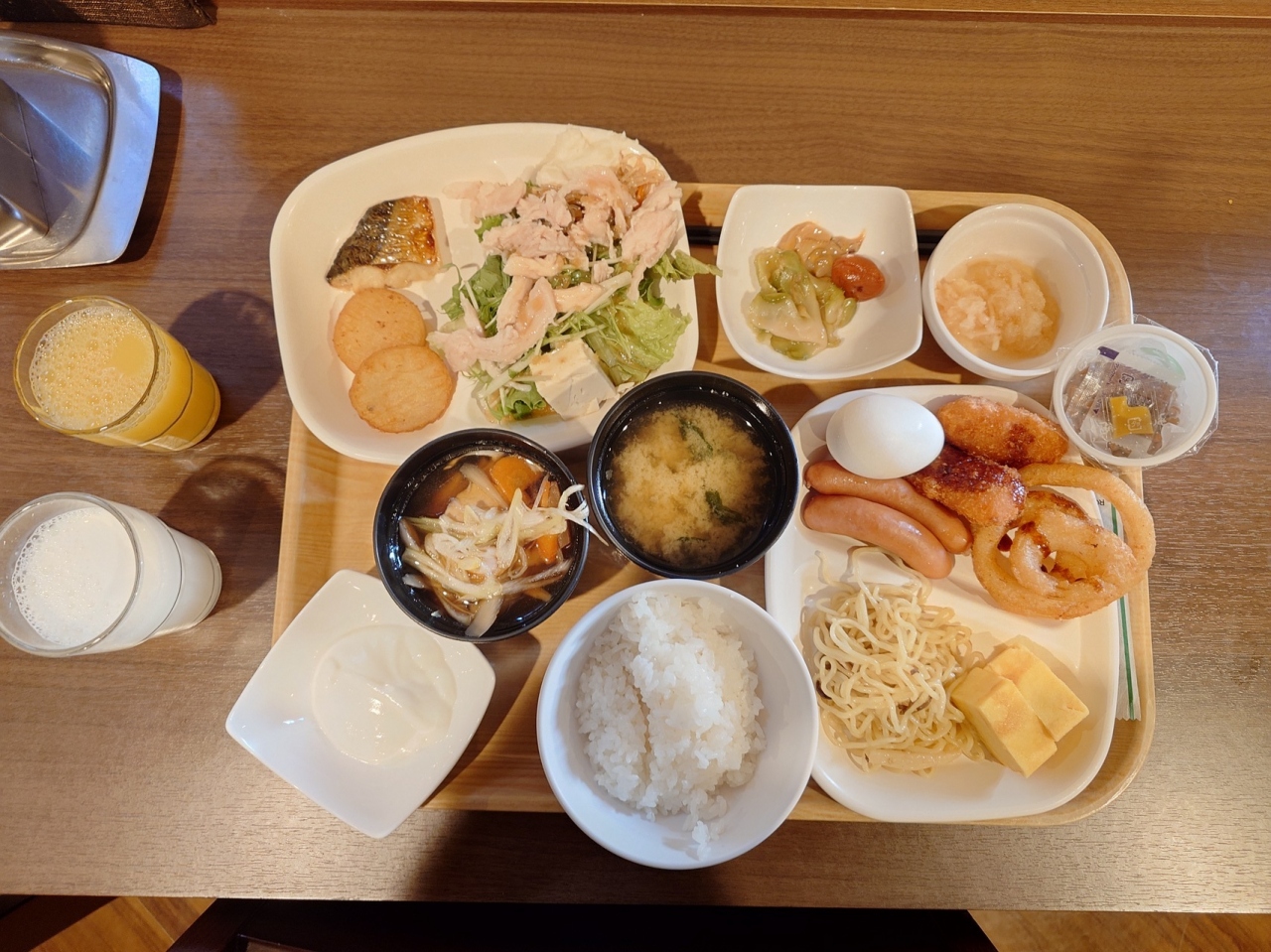 朝食はビュッフェスタイルで、メニュー数は普通。東京を意識したおかずがあり、デザートには榮太郎のあんこがありました。深川飯は少し固めの仕上がりではありますがまぁまぁの味。一方で特製カレーの海老カレーは少し塩味がきつかった。利用することはありませんでしたが、2階にはローソンが入っており、24時間営業。