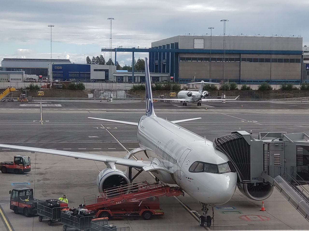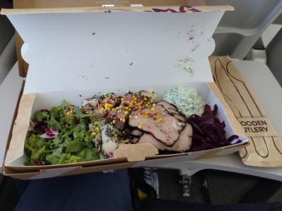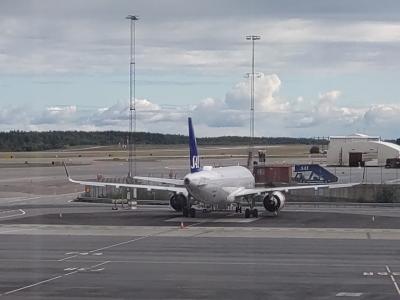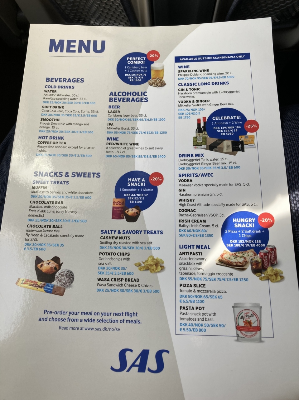 ビジネスクラスの設定はなく、一方でエコノミークラスの前方座席の数席が「SAS Plus」という設定があり、優先チェックインや機内無料Wi-Fi、無料の食事(弁当)、預け荷物数の増加などのサービスが追加されます。他の欧州域内線のビジネスクラスのように間の座席も販売されますが、最安値のエコノミークラスの場合、LCCのように預け荷物も有料なので、こちらはフルサービスで、差額もそう大きくはないので、コスパはこちらが良いと感じました。