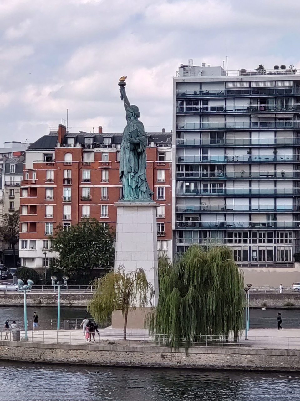 セーヌ川沿いのグルネル橋のたもとにある人工島にある自由の女神像。アメリカ独立100周年記念を祝うためフランスからアメリカに寄贈されたの自由の女神像のお礼として、アメリカからフランス革命100周年に贈られた像。アメリカのものの4分の1のサイズですが、橋から見るとそう小さいようには見えないのが不思議。大西洋を挟んでニューヨークの像と向かい合うように建っているとのこと。自由の女神が手にしている板には革命の年号1789年が記載されています。夜は薄暗いので昼間に行くのがベスト。セーヌ川下りの遊覧船から見ることもできます。ニューヨークの自由の女神像と比べると迫力はありませんが、エッフェル塔とセットで撮影することもできるので、パリ観光で訪れても良いスポットだと思います。