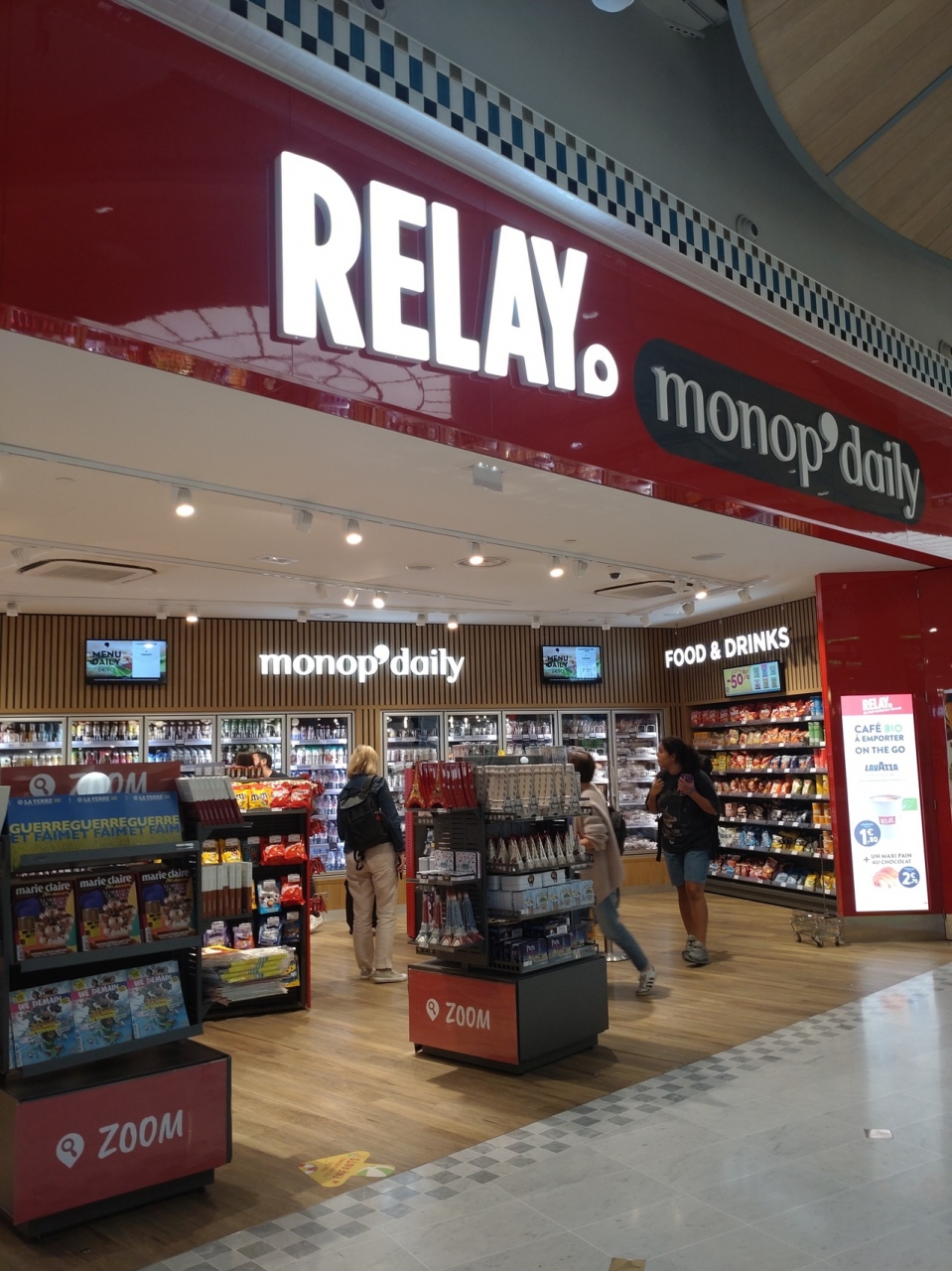 RELAYはフランスの空港や大きな駅では必ずと行ってよいほど見かけるお店で、通常、本や軽食、スナック類がメイン。Terminal1にあるお店は、空港内ということもあって、パリ市内で圧倒的な店舗数を誇る「monop'daily」というコンビニと提携しており、サラダやサンドイッチ、ドリンクが充実しているほか、パリの観光名所が包み紙や箱に印刷されたチョコレートやクッキー、マカロン、ナッツ入りのヌガー、更にはバリのお土産の定番、マキシム・ド・パリ、定番のゴディバのチョコレート、クッキー、スイスのチョコレートブランドトブラローネ(三角形のチョコ)やミルカなどのバラマキお土産にぴったりなものが充実。エッフェル塔や星の王子さまのデザインのマグカップ、キーホルダー、ペン、グッズ、テディベア、シャツなど、買い忘れた商品の多くがここで揃います。