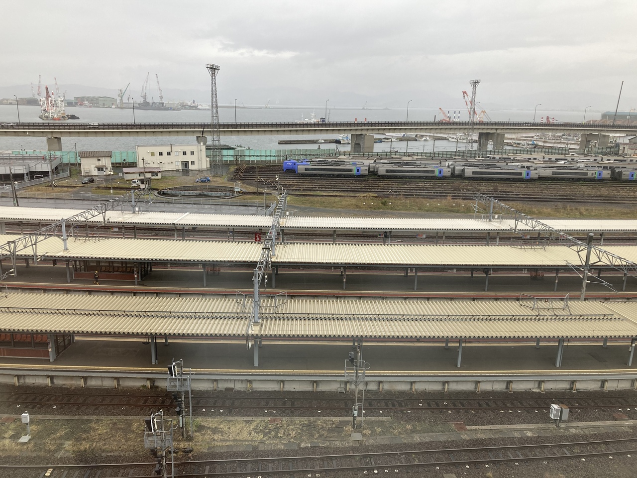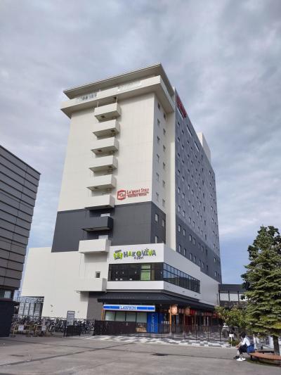 JR函館駅前、バスターミナルに隣接したにシティホテル。大きな提灯のある門の先にあるHAKOVIVA内にホテルがあり、コンビニ(ローソン)や昭和レトロなお土産店(函館駅横丁)、ジム(GOLD'S GYM)とも繋がっています。白壁ベースのロビーは広く、ゆったりくつろげるスペースもあり、フロントも比較的広く取られています。客室は、ゆったりしており、スーツケースを広げることも余裕で、明るい部屋という印象。デザイナーズホテルだけに、色はワイン色または濃い目の青をベースにまとめられており落ち着いています。駅の真横にあるので、部屋の窓から函館駅を出発する列車を見ることもできます。