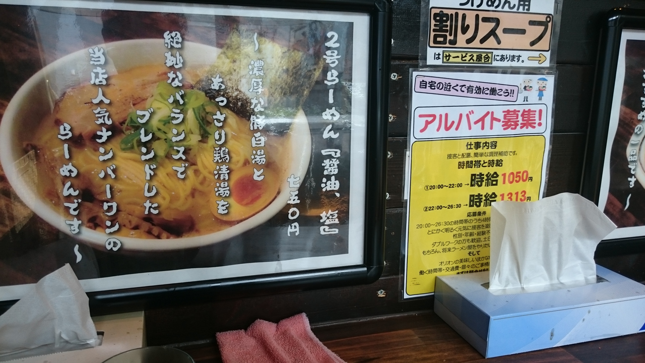 西武池袋線東長崎駅から徒歩数分のところにあり、都営大江戸線落合南長崎駅からも徒歩可能な場所。お店の前にはミストがあって涼しい。オリオン食堂というので沖縄かと一瞬思うがそうではなく、東長崎では、老舗のラーメン店。店内はラップが流れていたり閉め何となく南国。毎年の限定メニューがあるようで、今年はアサリそばでした。もやしと辛ニラが食べ放題で、もやしは特性の醤油で食べるとおいしく、ニラも辛すぎなく、ビールのアテにあいそう。ラーメンのスープは魚介系の出汁。三色つけ麺のつけ汁は毎日変わるようですが、今回は濃魚醤油味、エビ塩味、もつ味噌味。お椀3つ渡されルセルフサービス。濃魚醤油味は、ノーマルな魚介系濃厚スープで甘味があって美味しい。一番麺に絡んだ。エビ塩味はスープを開けたとたん海老の臭いがプンプンするタイプで少し塩辛い。もつ味噌味は、まさに単品メニューにあるもつ煮込みをスープで割った感じ。麺は中太麺のモチモチタイプ。海苔、半熟卵半分、大きめのシナチク、乾燥海老がのっている。麺の量はつけ麺の場合、200グラム、300グラム、400グラム同額で、お腹いっぱい。常に新しいものを研究しているチャレンジングなお店という印象。