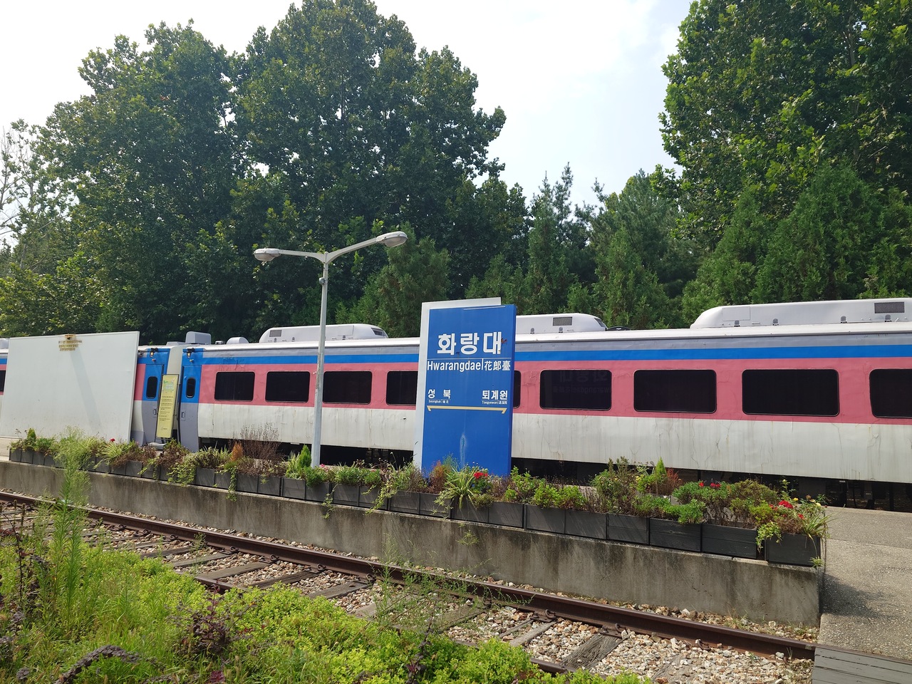 ソウル・北東部、地下鉄6号線、花郎台駅から京春線森の道(遊歩道)を徒歩10分くらい、そのゴールにある旧花郎台駅にある鉄道公園。開業当時は泰陵(テヌン)駅と呼ばれていましたが、1958年に隣接する陸軍士官学校の愛称「花郎台」にちなんで改称されました。1日に7本のムグンファ号が停車する駅でしたが、2010年、京春線の複線化による経路変更により、ルートが変更されて廃止されました。