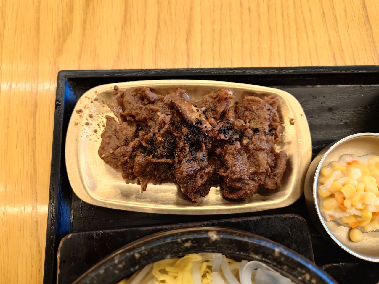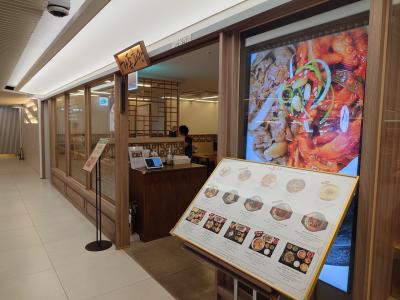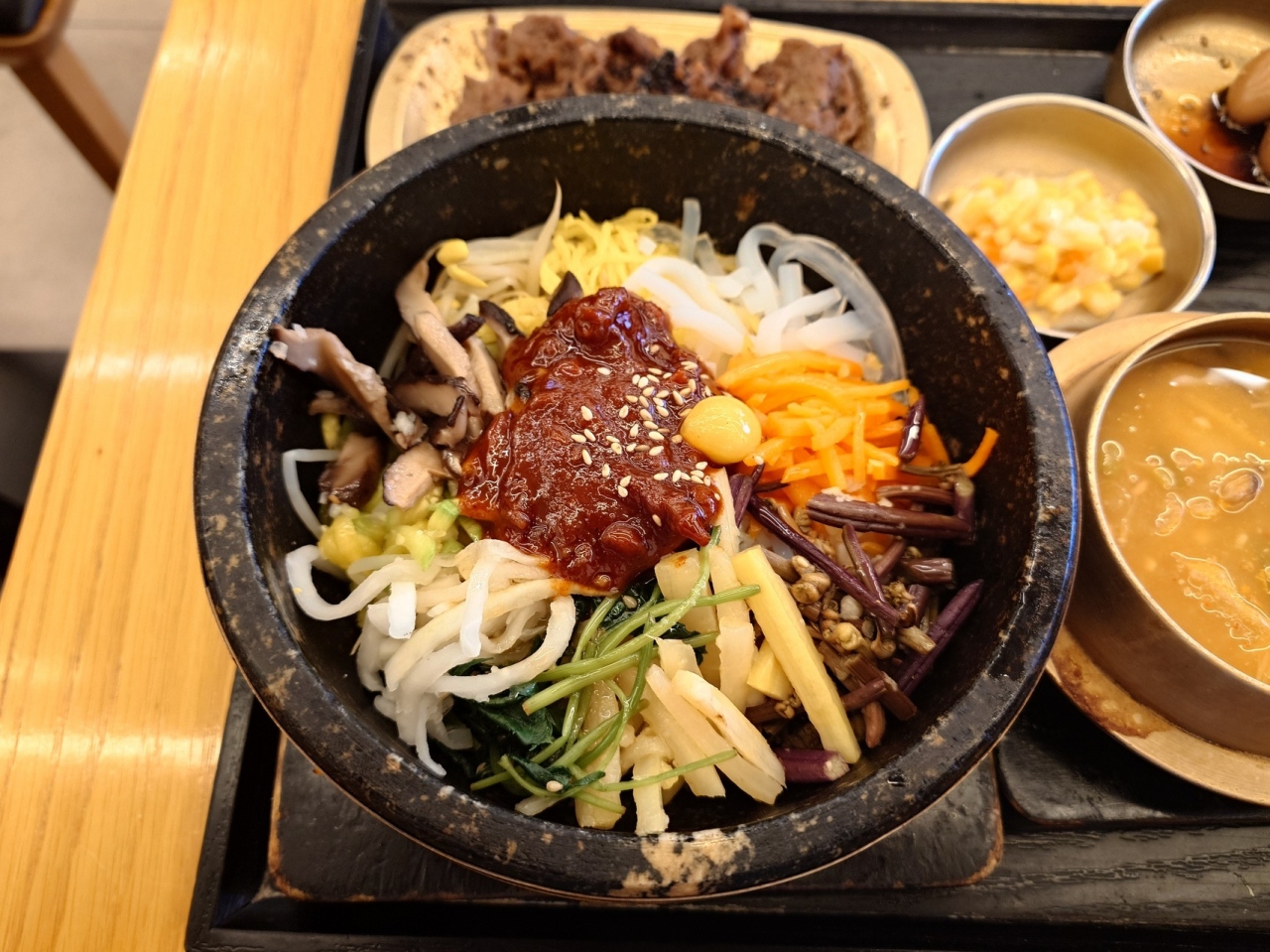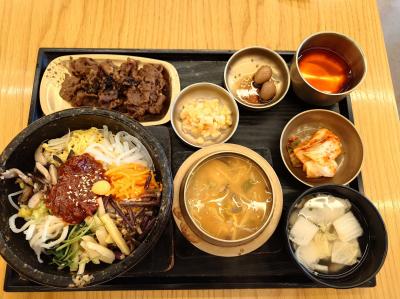 明洞のロッテ百貨店ソウル本店13階のレストラン街にあるビビンバのお店。家族会館は、ビビンバ発祥の地、全州の有名店。本場では石焼よりも普通のビビンバが好まれるようですが、こちらでは石焼よビビンバのメニューも豊富。少々お高いですが、セットメニューがオススメとのことで、一番人気の「佳縁牛肉セット」をオーダー。運ばれてきたビビンバは、彩りがよくきれい。ほうれん草、きゅうり、椎茸、エノキ、銀杏などに加えて牛肉、コツジャンが乗ったビビンバをよく混ぜると、辛すぎず、それぞれがバランス良く絡まって美味。おかずの牛肉は、これぞ韓国風の味付けですが、ちょうど良い甘さ。鶉の卵、水キムチなども、箸休めにちょうど良く、バランスが取れています。熱々のチゲ(味噌汁)も具材が豊富で美味しかったです。
