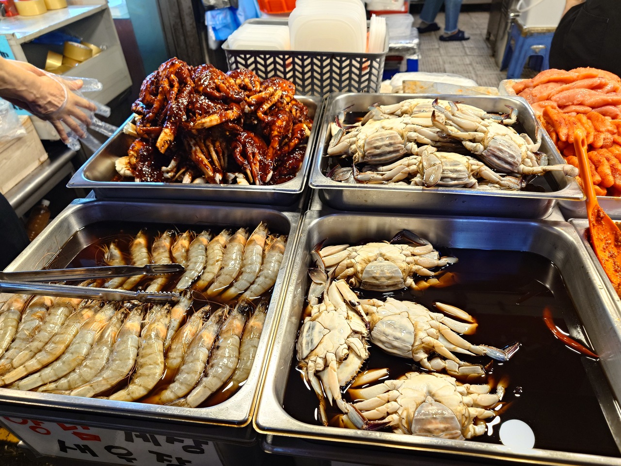 広蔵市場にある韓国料理に欠かせないおかず「パンチャン」のお店。1952年創業の老舗で、元々は松茸のお店だったとのこと。北2門ゲートから徒歩数分のところにあり、周辺はチヂミのお店が多い。イカの塩辛(オジンオジョッ)や明太子の塩辛(ミョンナンジョ)、アミエビの塩辛(セウジョッ)、エゴマの葉のチャンアチ(ケンニプチャンアチ)、レンコンのジョリム、イワシの炒め物、もちろんナムルもなど、韓国のレストランで必ず見かけるおかずはもちろんですが、オススメはカンジャンケジャン(渡り蟹の醤油漬け)やカンジャンセウ(海老の醤油漬け)。カンジャンケジャンが1匹、20000ウォン、カンジャンセウが8匹で10000ウォンとリーズナブル。にんにく醤油が染み込んだカニや海老を、日本の自宅でも食べることができます。お店の方は日本語が堪能で会話も安心。スーツケースに入るように、かなり厳重にパッキングしてくれるのもありがたい。