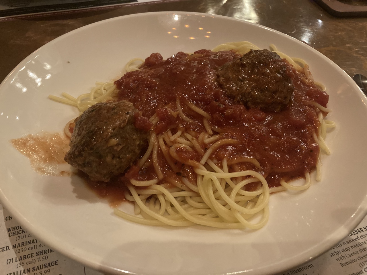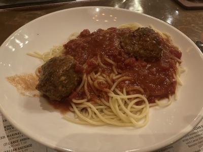 サンディエゴのダウンタウンにあるファミレス風のスパゲティ専門店。1967年にアメリカ•オレゴン州生まれのチェーン店。西海岸を中心に40店ほどあり、このほかカナダや日本にも神戸と名古屋にフランチャイズ契約をしたお店があります様。高い天井と広々とした少し薄暗い店内は、他のスパゲティファクトリーと同じで、アイコンとなるトロリーが設置されるなど、アンティークな雰囲気。ライトや木製の椅子、テーブルは古き良きオールドアメリカを想像させます。メニューは、お店の名前の通り、パスタがメイン。ミートソースやマカロニチーズなど、日本人の口に合うパスタばかり。全ての料理はセットメニューで、サワードウブレッド、スープとサラダがついてきます。オススメは、アメリカの国民食とも言えるミートボールスパゲティ。シンプルながらも奥深いマリアーナソース(トマトとニンニク、オリーブオイル、バジルで作られたトマトソース)に、大きめのミートボール(日本人にはハンバーグのようにも見える)が乗るボリュームのあるもの。パスタも茹で加減は、アメリカ人好みのコシのない、柔らかめ。ソースは日本のトマトソースに比べて酸味が強い。パスタの量はかなり多いので、お腹がいっぱいになります。本格的イタリアンというわけではありませんが、なぜか懐かしい、アメリカ人好きなパスタを食べるのも悪くない。キッズメニューも豊富なので家族で行くのも良いかも。