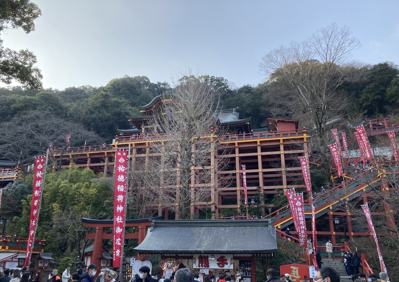 佐賀県鹿島市にある日本三大稲荷神社の一つ。年間の参拝者は約300万人と九州では太宰府天満宮に次ぐもので、佐賀県屈指の観光スポット。商売繁盛、家運繁栄、交通安全、縁結びなどのご利益があると信仰されています。豪華で美しい社殿はインスタスポットでもあり、佐賀を舞台にしたタイのドラマ「ガタの国から」でと取り上げられたことから、タイ人観光客には超有名なスポットともなっています。本殿参拝後、神社裏の石壁山山頂の奥の院まで、急な階段を300m登りましたが、プチ山登りでもあり、かなり疲れました。ただ、奥の院からの眺望は素晴らしいものでもありました。