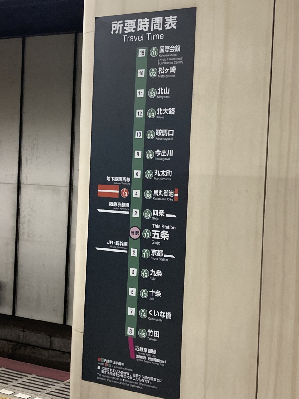 国際会館駅(左京区)から京都駅を通り、近鉄京都線竹田駅(伏見区)までの15駅、13.7kmを結ぶ京都市営の地下鉄路線。京都市を南北に貫く路線で、北大路駅から十条エネルギー間は烏丸通りの地下を通る。1981年に北大路駅~京都駅の開通以来、1988年に京都駅~竹田駅間、1990年に北山駅~北大路駅間、1997年に国際会館駅~北山駅間が延伸されて今の形となった。竹田駅では近鉄京都線と接続しており、近鉄奈良までの相互乗り入れも実施されています。京都の中心部を通り、周辺には大学も多いことから、一日平均28万人が利用しており、一日中混雑している印象。特に東西線との接続駅である烏丸御池駅から、阪急京都線の接続駅四条駅、京都駅間はかなり混雑する。