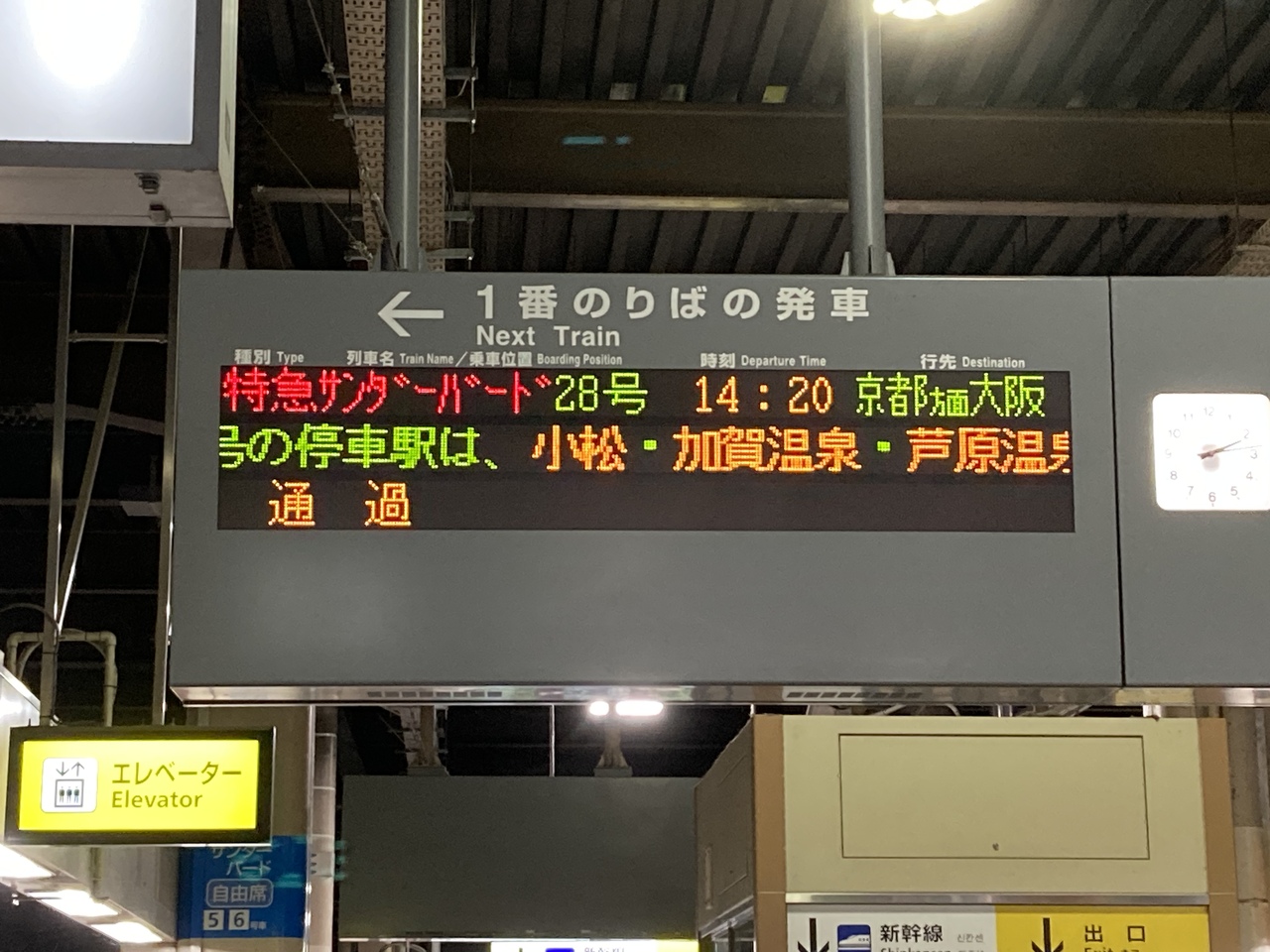 大阪~金沢・和倉温泉を結ぶJR西日本の特急。JR京都線、湖西線、北陸本線を通り、金沢から先はIR石川鉄道線、七尾線を通る。現在、1日25往復運転されており、1往復のみ和倉温泉に直通する。最速のサンダーバード37号(下り)は、金沢→大阪間を2時間31分で結んでおり、表定速度は日本最速となる。他の列車も概ね2時間35分~40分で速達列車でもある。車両はJR西日本の681系または683系が用いられており、先行試作車からすると、既に30年以上となっており、置き換えを期待したいが、北陸新幹線敦賀開業で運行区間が短縮される見込みなので、当分は置き換えはないだろう。普段から混雑する特急で、指定席が取れないこともある。