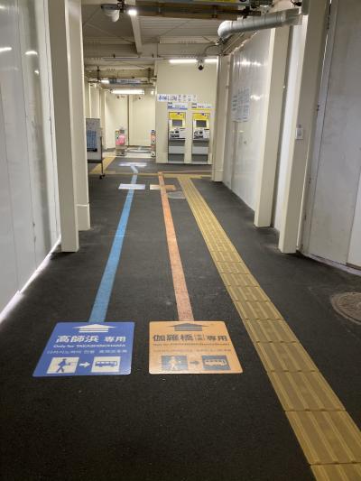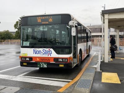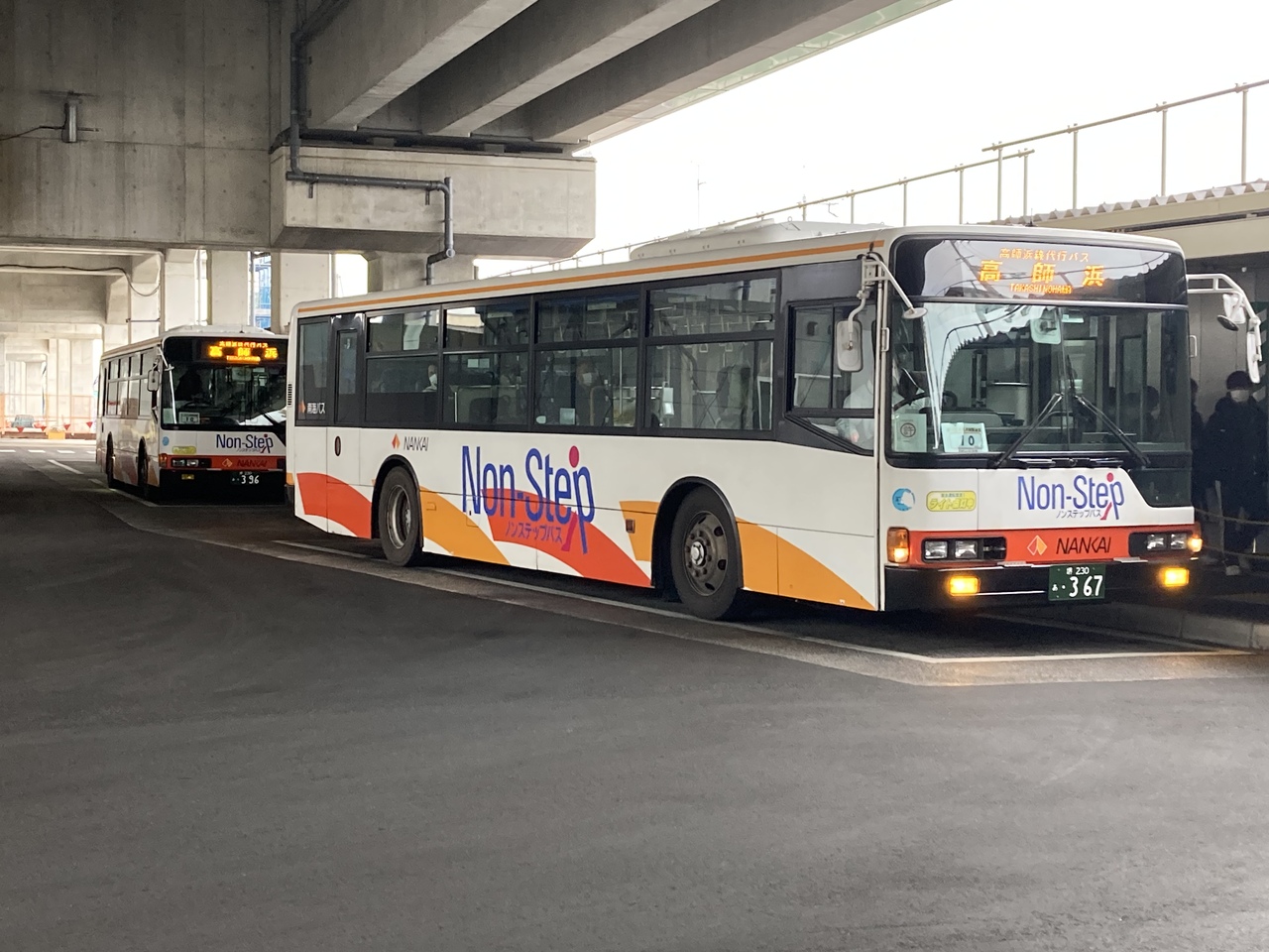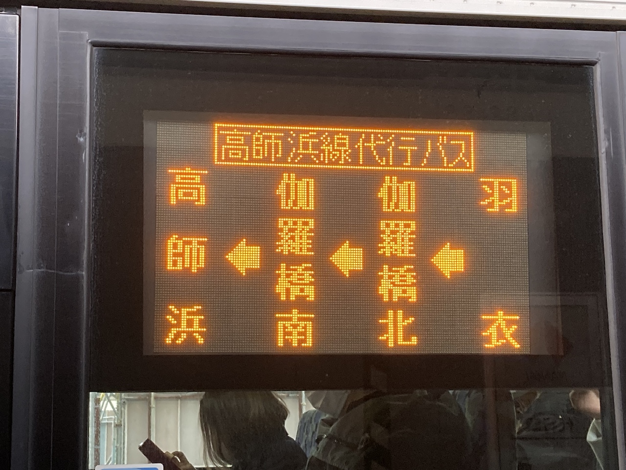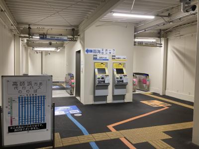 羽衣駅では代行バスでの運賃収受を減らすため、伽羅橋駅、高師浜駅それぞれの降車駅(停留所)ごとに分かれた自動改札になっており、代行バス乗り場は、外からは入れないようになっています。伽羅橋駅は、鉄道駅近くにバス停が設けられず、堺阪南線に「(代行)伽羅橋(北)駅」と「(代行)伽羅橋(南)駅」が設けられています。終点となる高師浜駅は、大阪府立臨海スポーツセンターの敷地内に代行駅(バス乗降場)が設けられていますが、高師浜駅からは少し離れています。