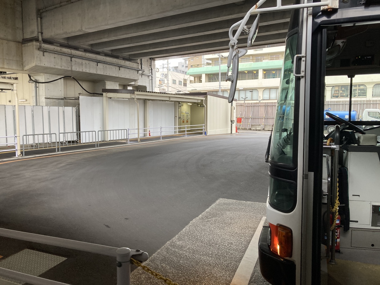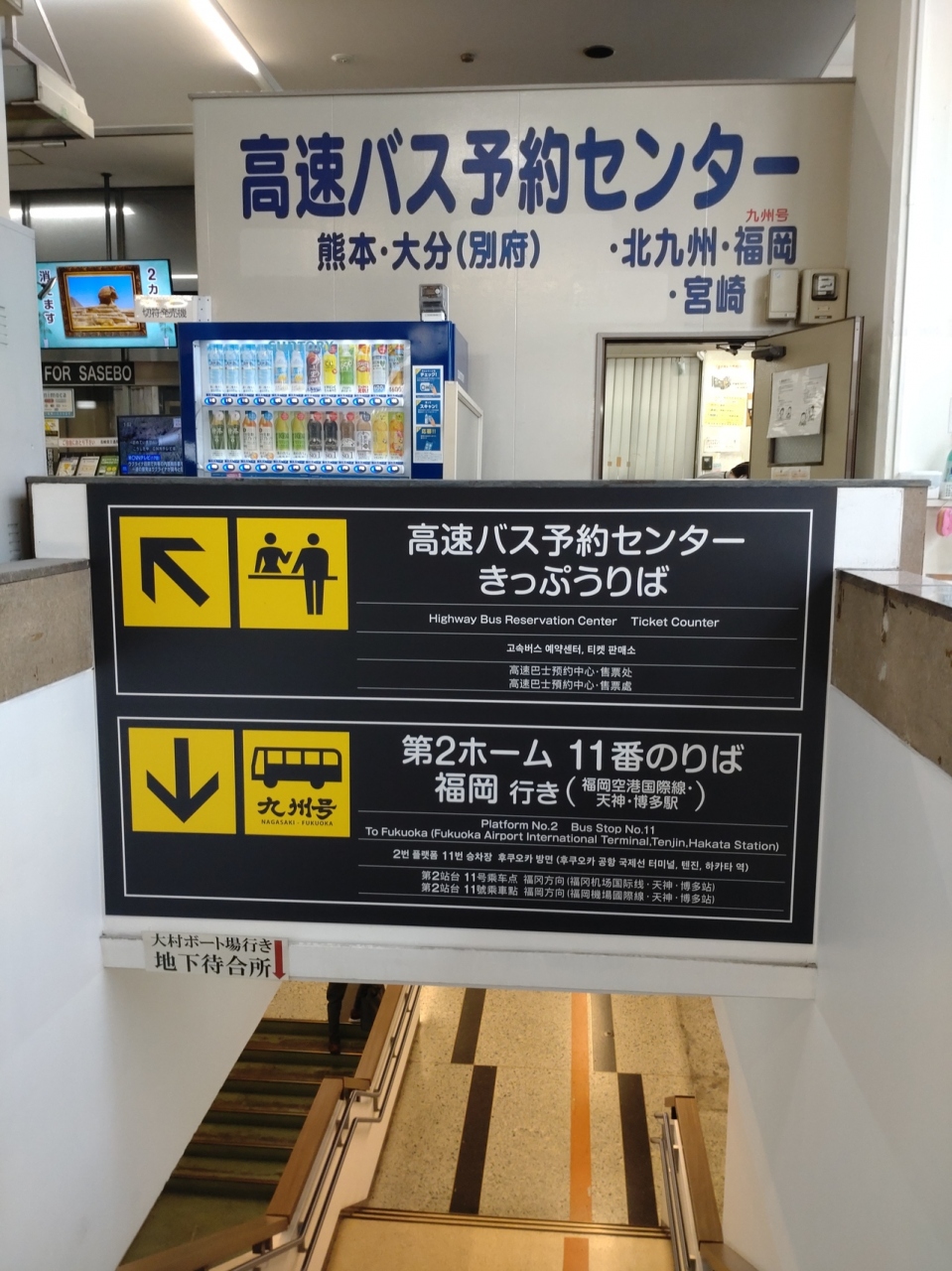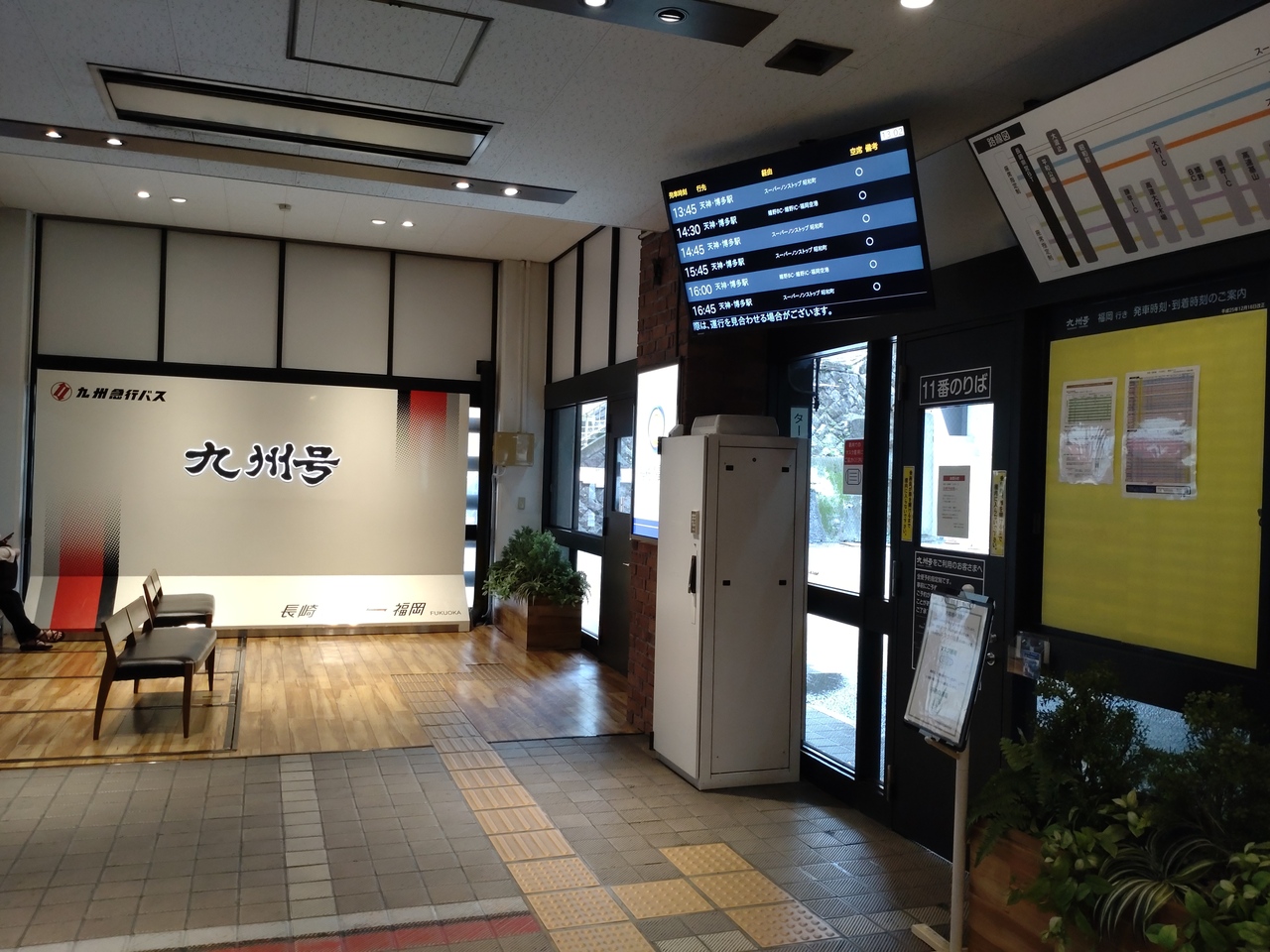 JR長崎駅のおむかえ(新幹線で少し離れましたが)にある長崎交通産業ビル(交通会館)の1階にあるバスターミナル。長崎空港をはじめ、佐世保・ハウステンボス、雲仙、熊本、福岡(九州号)など九州内、京都・大阪・神戸行(オランダ号)など、1日約300便のバスが発着、約5000人が利用。1963年に完成した築60年近くのビルなので、外観、内部ともに昭和レトロの雰囲気で切符売場、売店も渋い感じ。地元紙によると建替の検討はされているが、決定した再整備計画が一旦白紙になるなと、なかなか進んでいません。