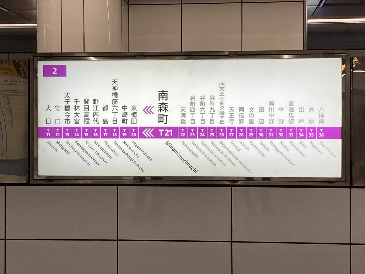 大阪府守口市の大日駅から天神橋筋六丁目、東梅田、天王寺を通り、八尾市の八尾南までの26駅、28.3kmを結ぶ大阪メトロの地下鉄線。大阪メトロの最長路線で、大阪メトロ全路線と接続しているほか、大日で大阪モノレール、野江内代でJRおおさか東線(JRの駅名は野江)、天神橋筋六丁目で阪急千里線、東梅田で阪急、阪神、JR、南森町でJR東西線(JRの駅名は大阪天満宮)、天満橋で京阪、谷町九丁目で近鉄(近鉄の駅名は大阪上本町)、天王寺でJR、近鉄、阪堺、阿倍野で阪堺との乗り換えができる。