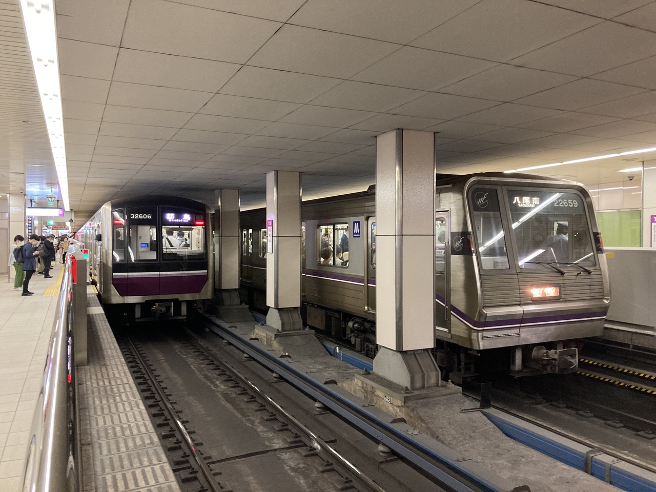 大阪市内中心部は谷町筋を走るが、阿倍野から先、平野までは1980年に廃止された南海平野線のルートに沿って走り、駅名も継承されています。また、終着駅の八尾南駅は、谷町線唯一の地上駅で、南側はしっかりとしたターミナル駅舎ですが、北側は八尾空港の駐機場として利用していた土地であるため何もない空き地となっています。