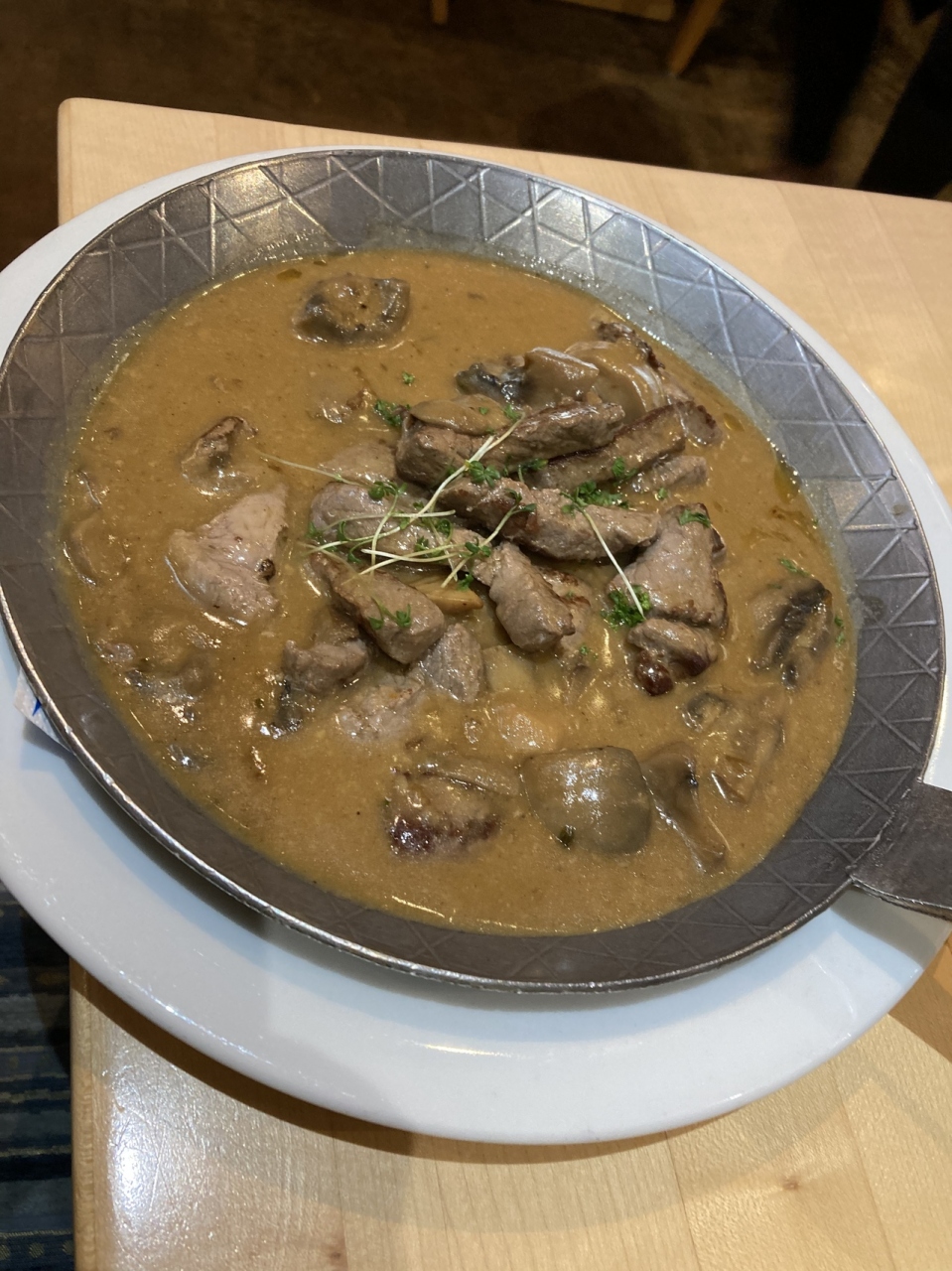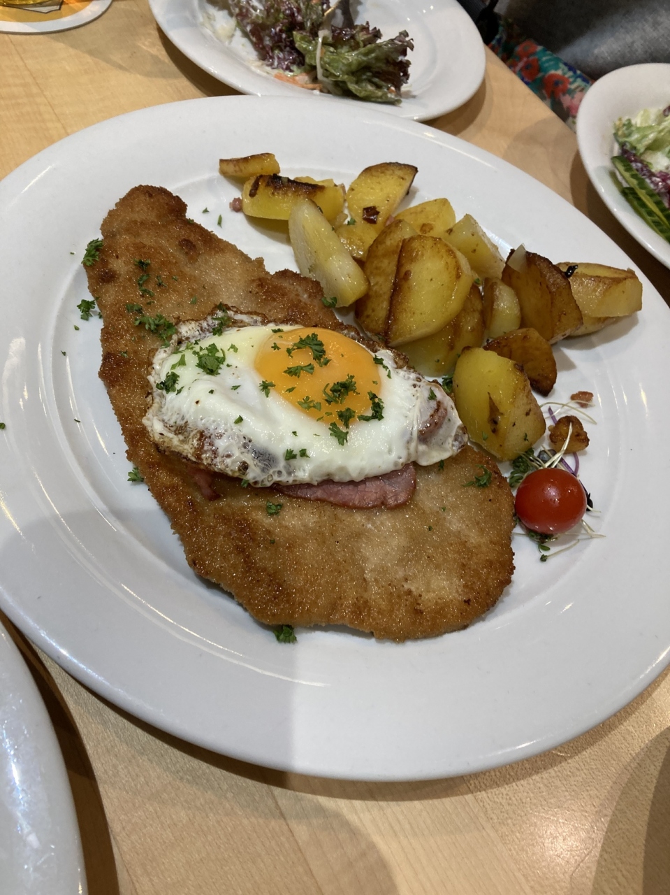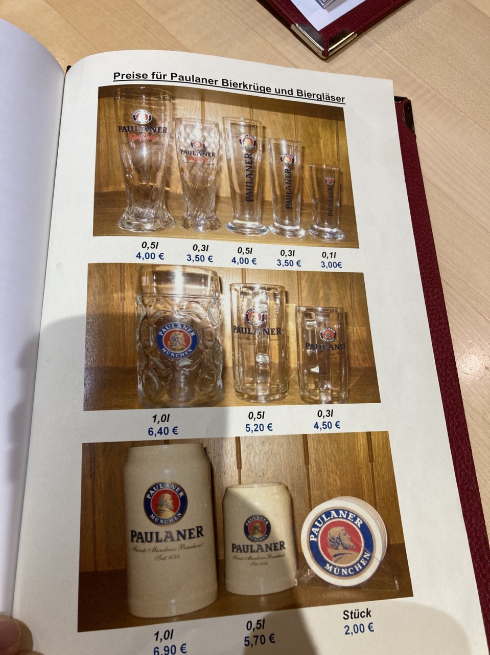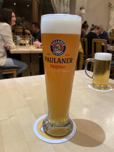 ミュンヘンで開催されるオクトーバーフェストにも出店するお店だけあってビールは美味。サイズを選ぶことができるので、複数の種類のビールを楽しむこともできます。料理はバイエルン料理を中心に豊富。ドイツ定番のシュニッツェルは、お肉が柔らかく美味。はじめ人間ギャートルズに出てきそうな「マンガ肉」のようなシュバイネハクセは、豚の足をローストにして低温で焼き上げたもの。少し大味ですが、柔らかいお肉で意外と食べられました。後で知ったのですが、こちらにはフランクフルトでは珍しく白ソーセージ(ヴァイスヴルスト)もあるとのこと。食べればよかった。