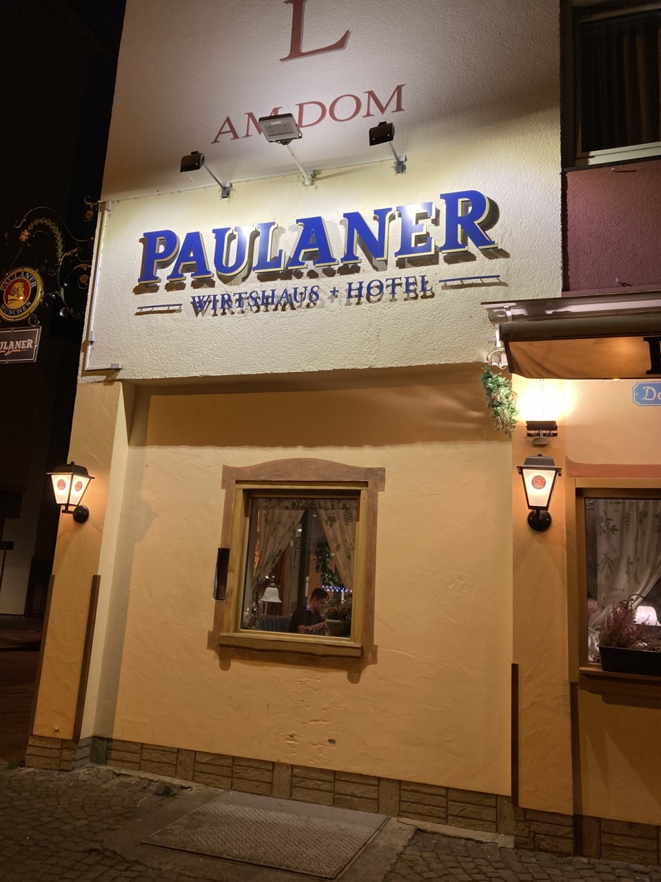レーマー広場近くの大聖堂裏、UバーンU4線、U5線Dom/Römer駅、トラム11線、12線Römer/Paulskirche駅から歩いて数分のところにある、ドイツで有名な醸造所、パラウナーが経営するビアレストラン。夜歩く場合(日本に比べると格段に暗い)、本当にお店があるのか、一瞬考えてしまうのですが、ホテルの下にあるのですぐに見つけることができます。フランクフルト中央駅構内にも支店がありますが、こちらが一番古いお店とのことで、結構混雑していましたが、店員さんがテキパキと動いているので、すぐに入ることができました。