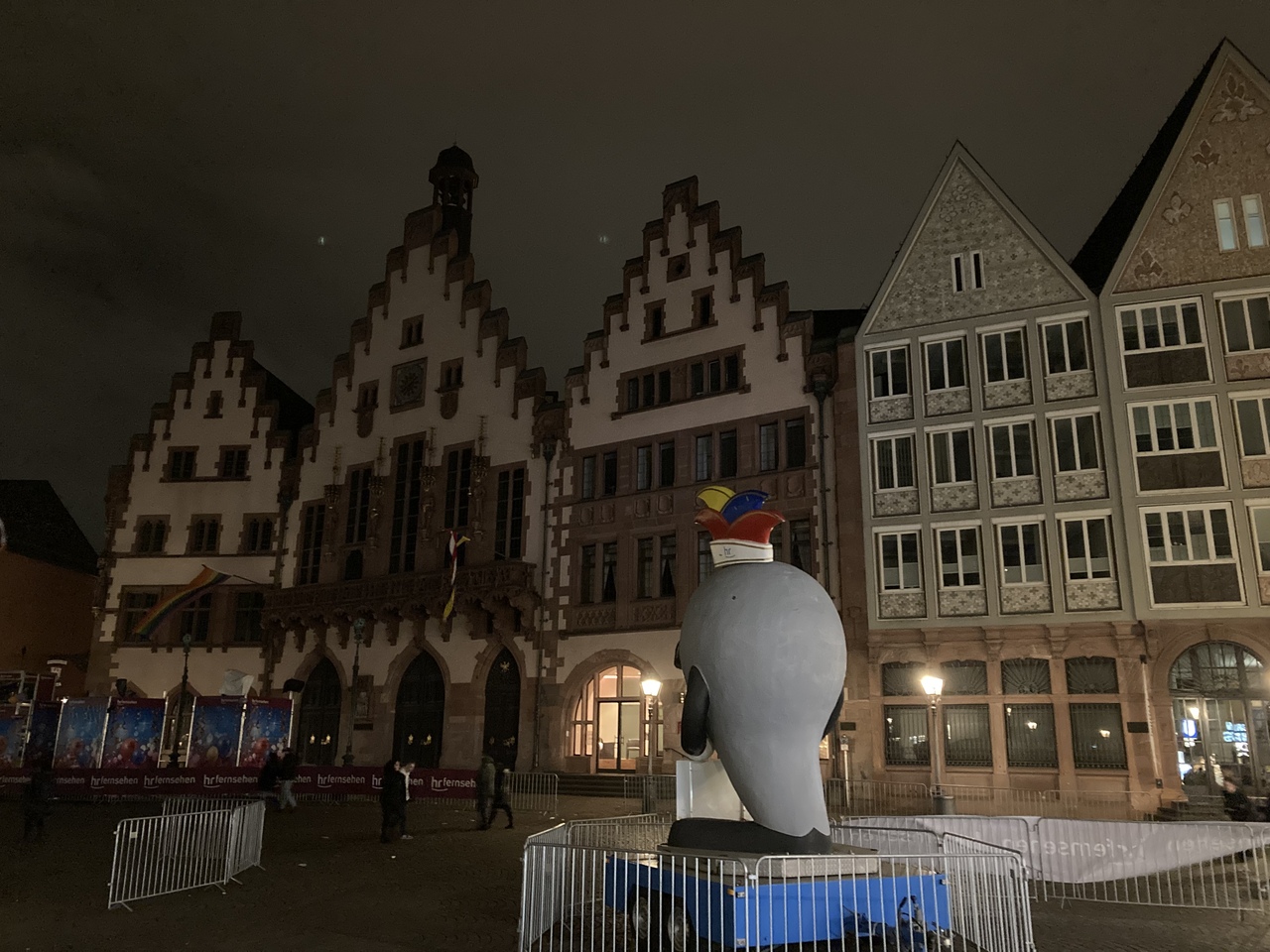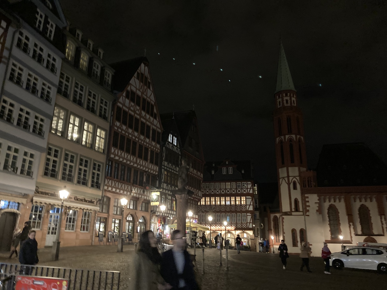 フランクフルトの定番観光スポット。階段状の切妻屋根の3つの建物のうち中央の建物は、Ramörと呼ばれる旧市庁舎で、2階には神聖ローマ帝国の皇帝の載冠式のあとの祝宴が開かれた広間、カイザールがあります。また、右の建物は観光案内所になっています。一方、ニコライ教会の左側は、「オストツァイレ」と呼ばれる木組みの建物が並んでおり、レストランやお土産屋さんが入っています。