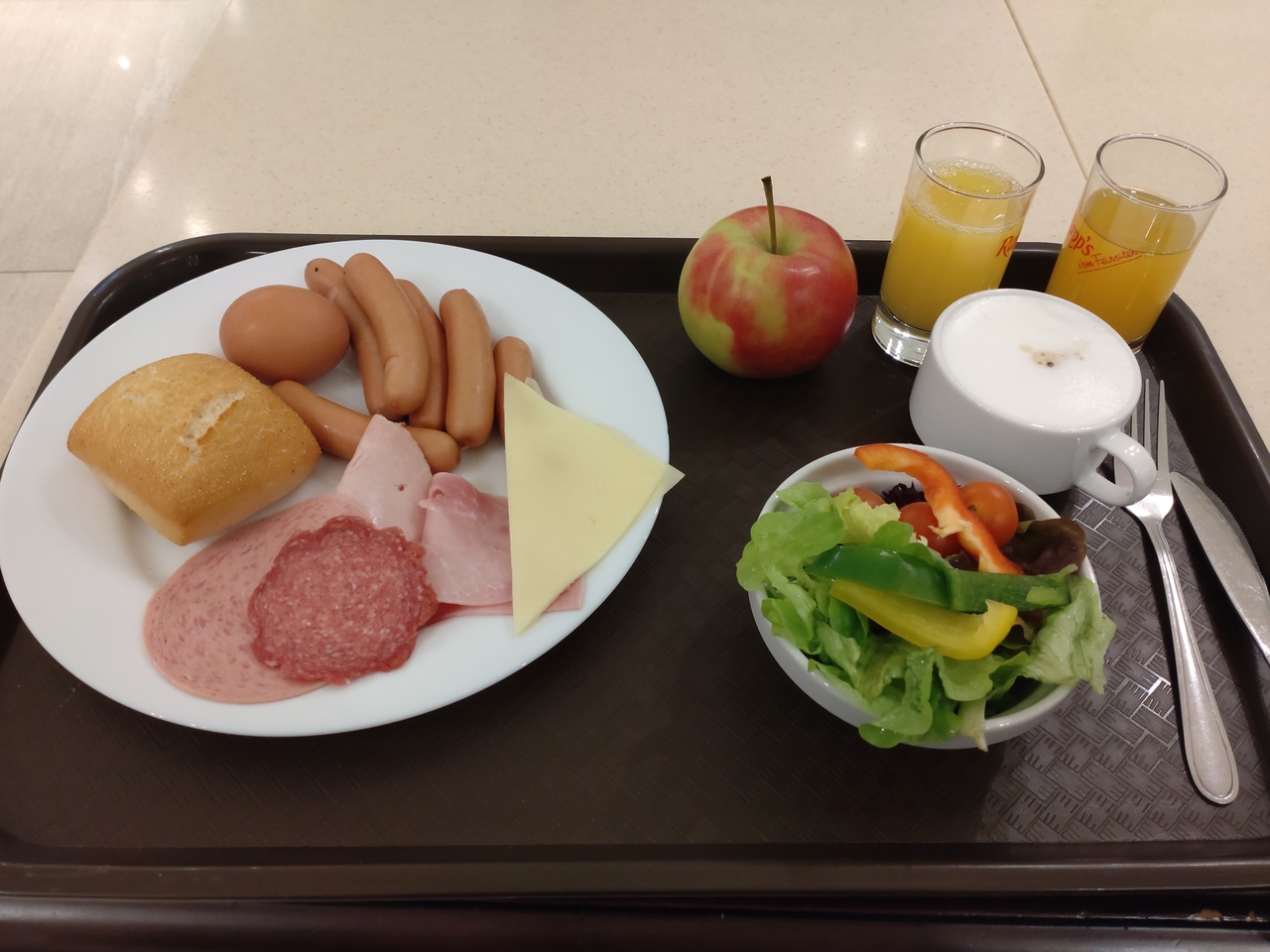 3ユーロの朝食付きのプランしかなく(形の上では、無料朝食にはなっていない)、朝食は日本と同様ロビーでいただく方式。ドイツ名物のソーセージや、ハム、チーズ、パン、生野菜、りんご、バナナ、ヨーグルト。さらには温かいお味噌汁とご飯(残念ながら日本米ではないようですが)があるのは嬉しいサービス。たくあんやゆかりなどのふりかけもあるのも良い。